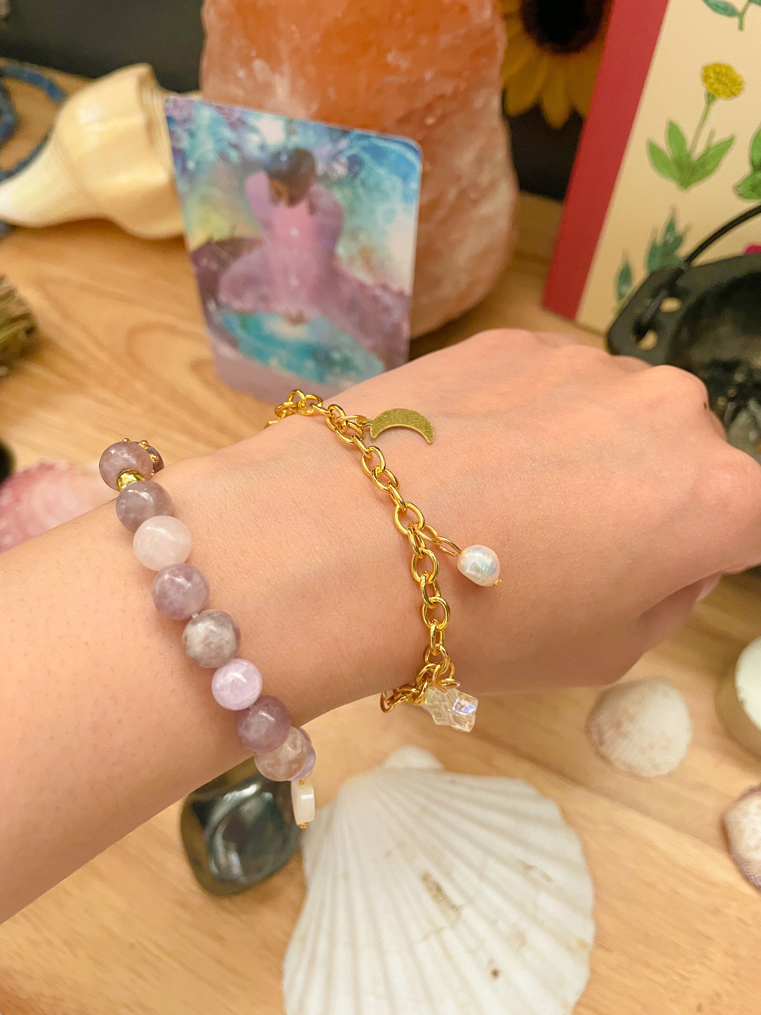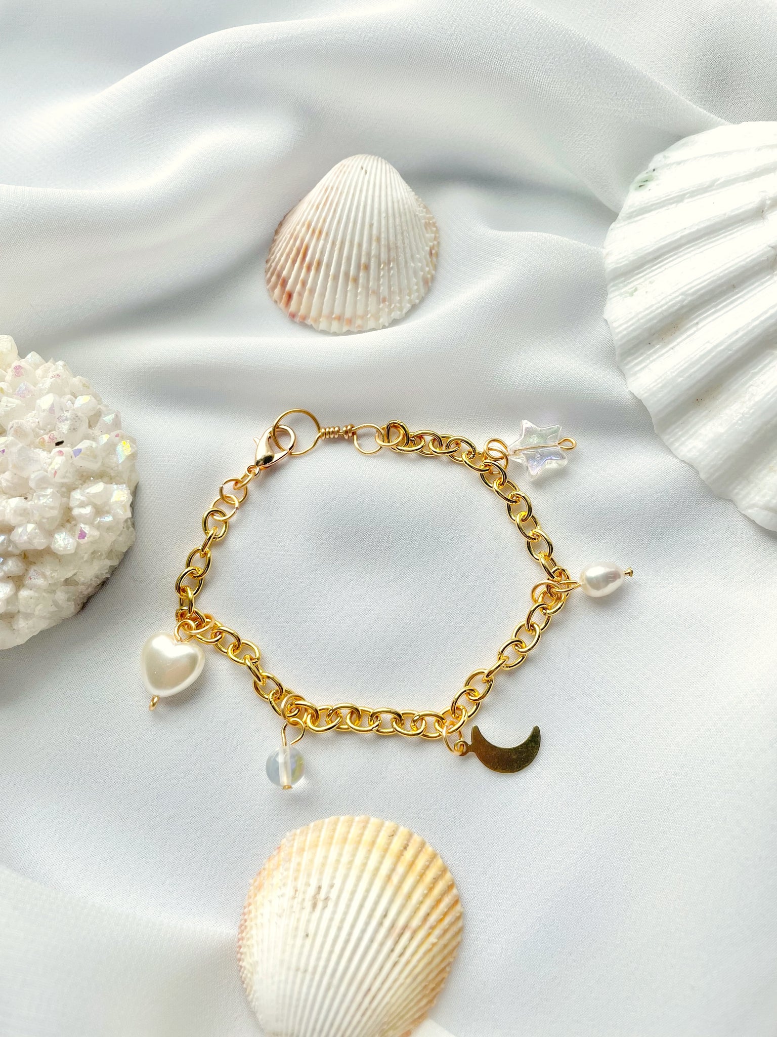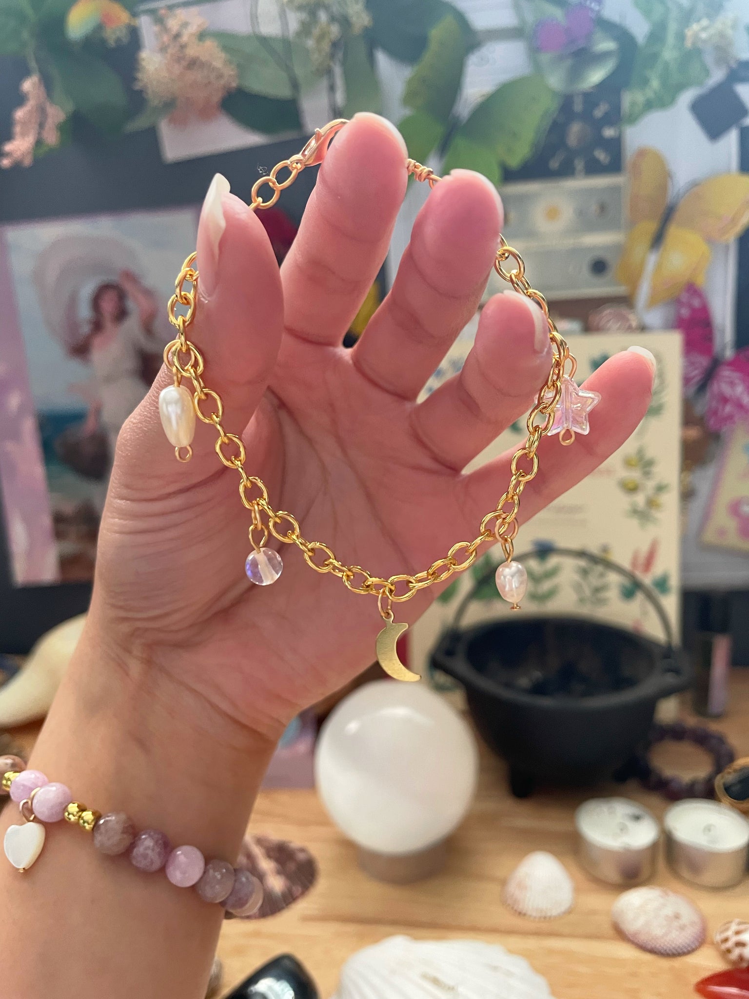 Handcrafted with a 22k gold plated chain, tarnish resistant jewelry wire, a genuine fresh water pearl, genuine angel aura quartz, brass gold moon charm, and acrylic bead charmsÂ