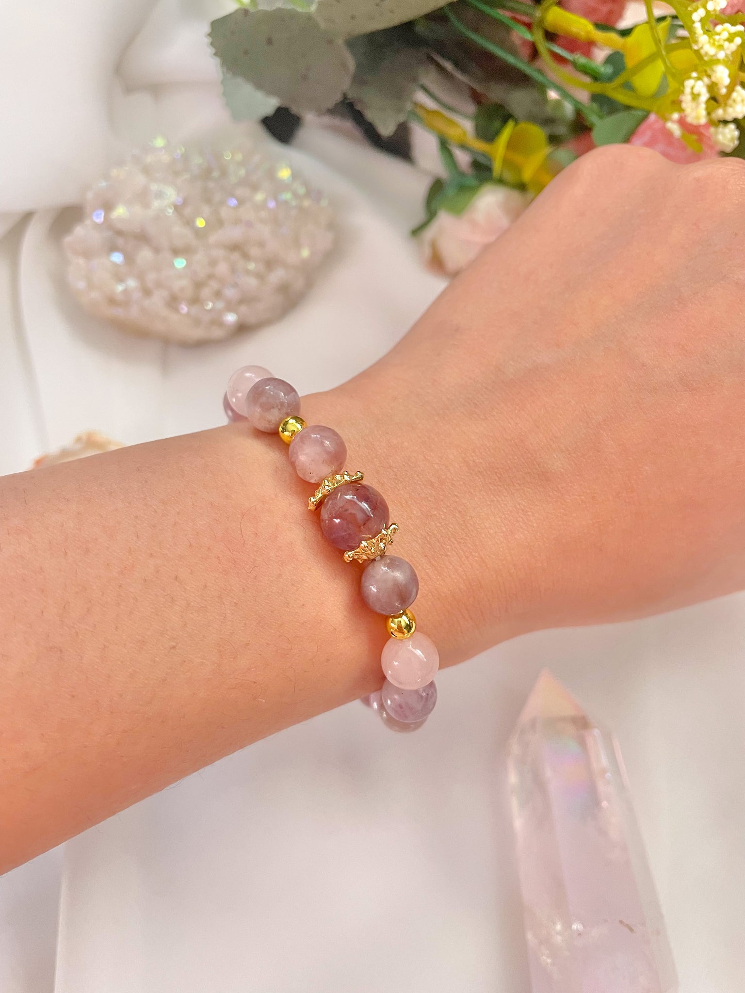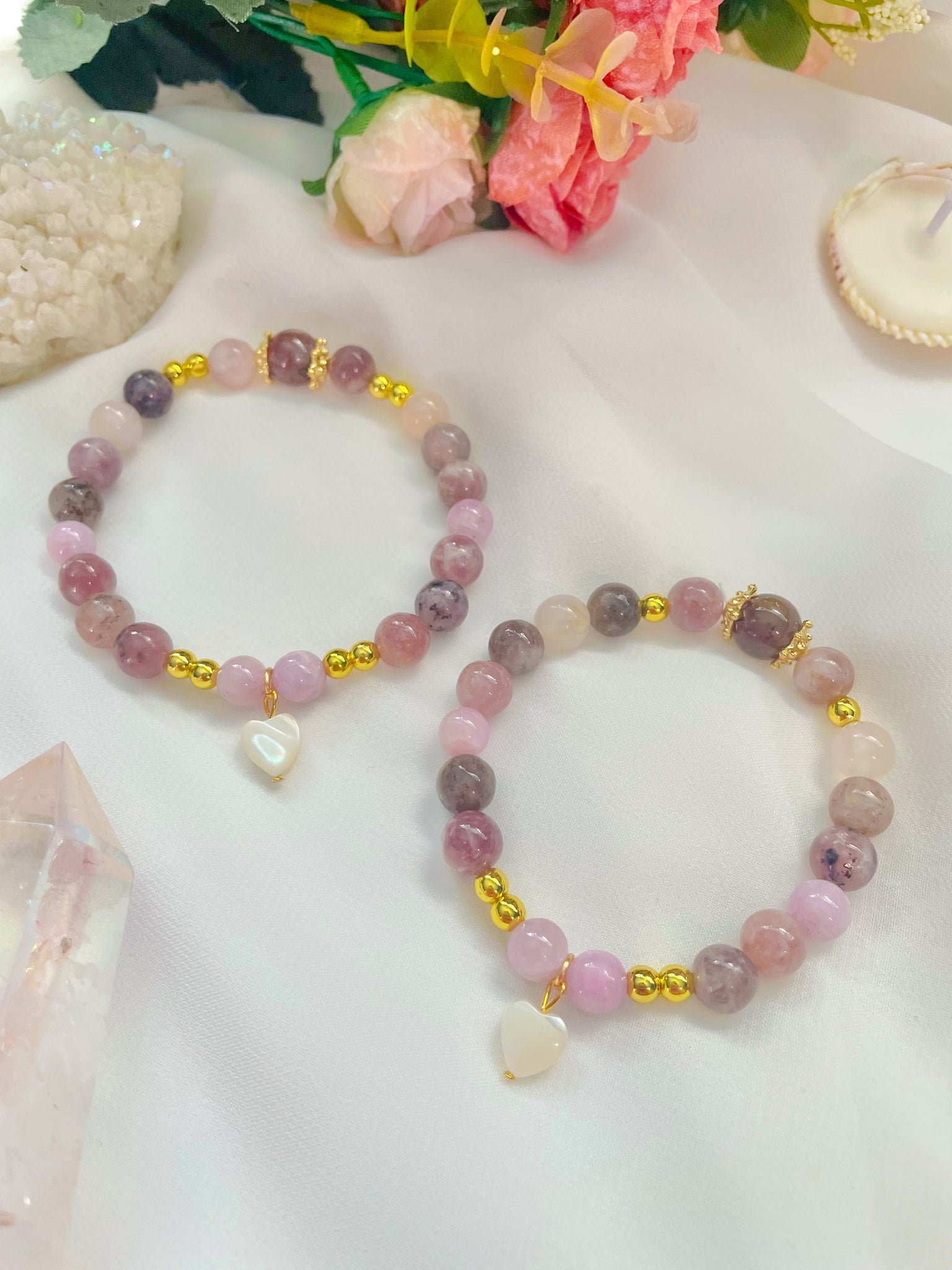 Handmade with genuine and natural Lepidolite, Auralite 23, Kunzite, Rose Quartz, and 18k gold plated hematite