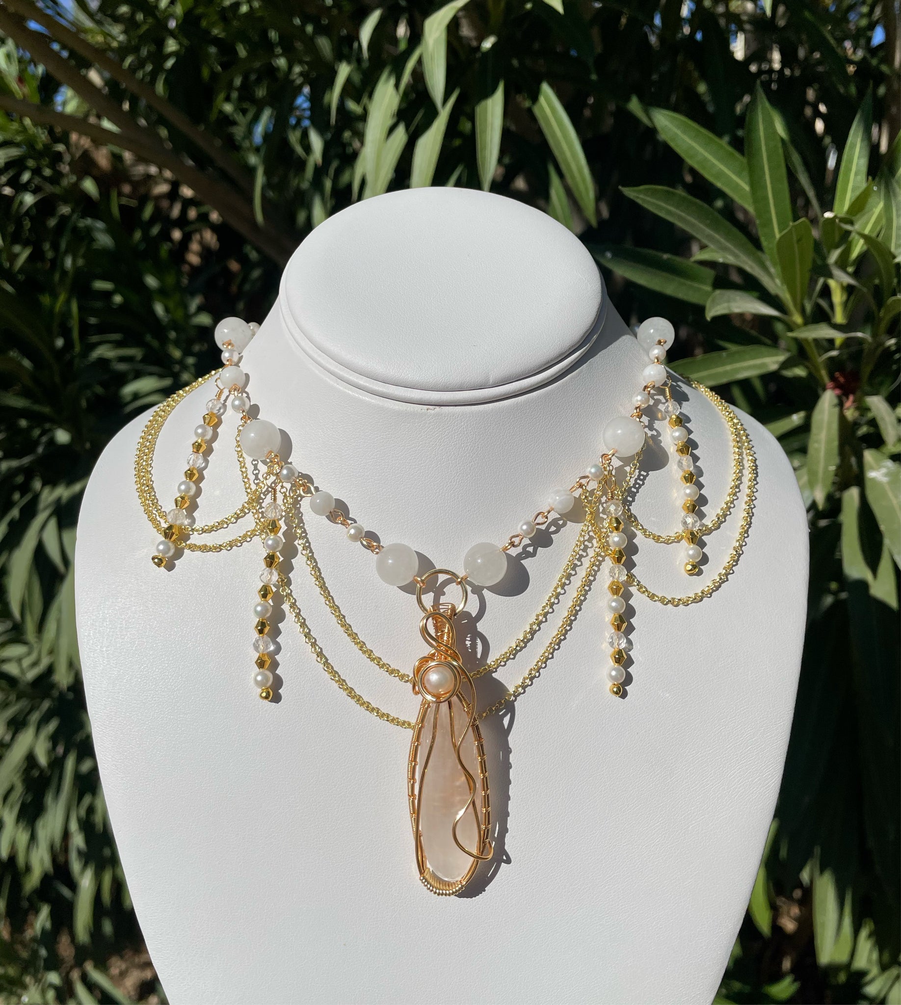 Handmade with genuine satin spar selenite,moonstone, white jade, mother of pearl, and fresh water pearls