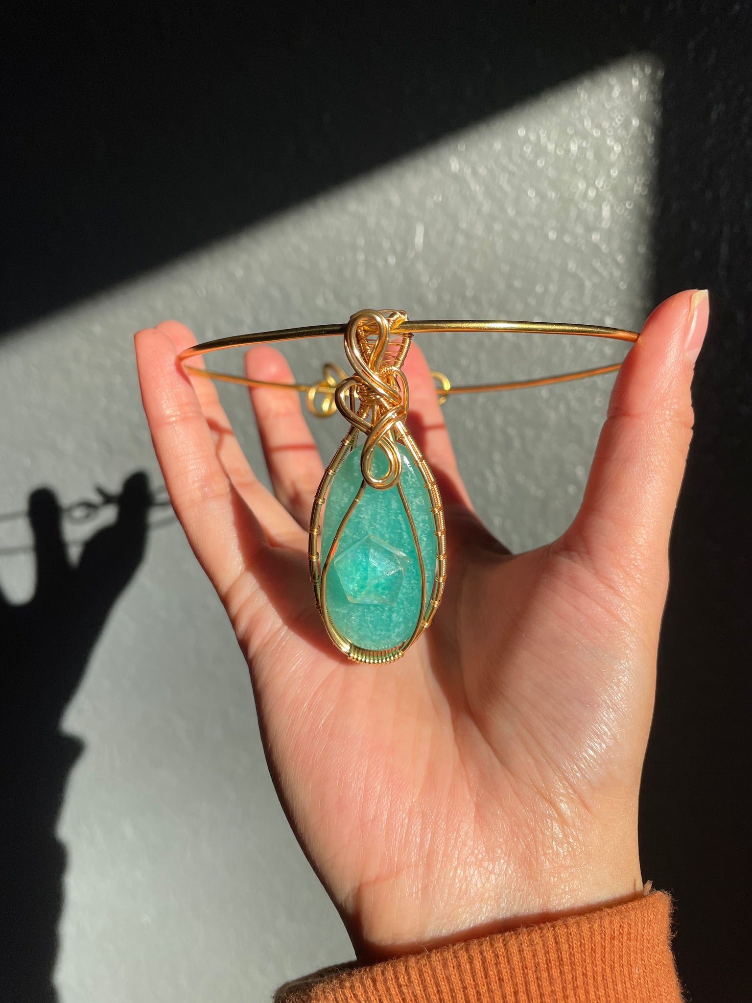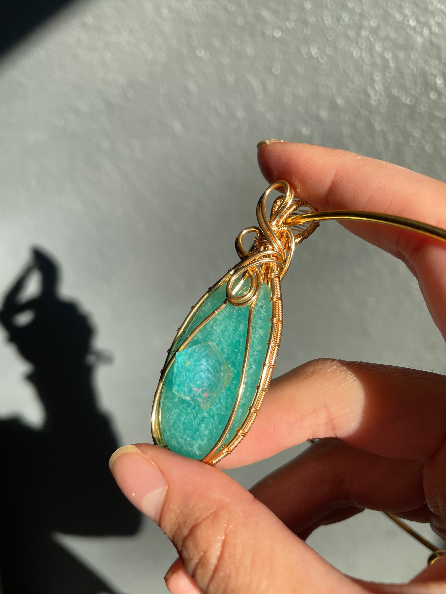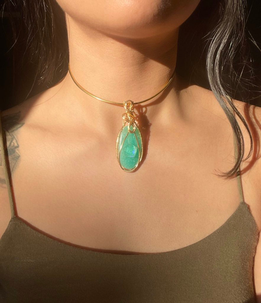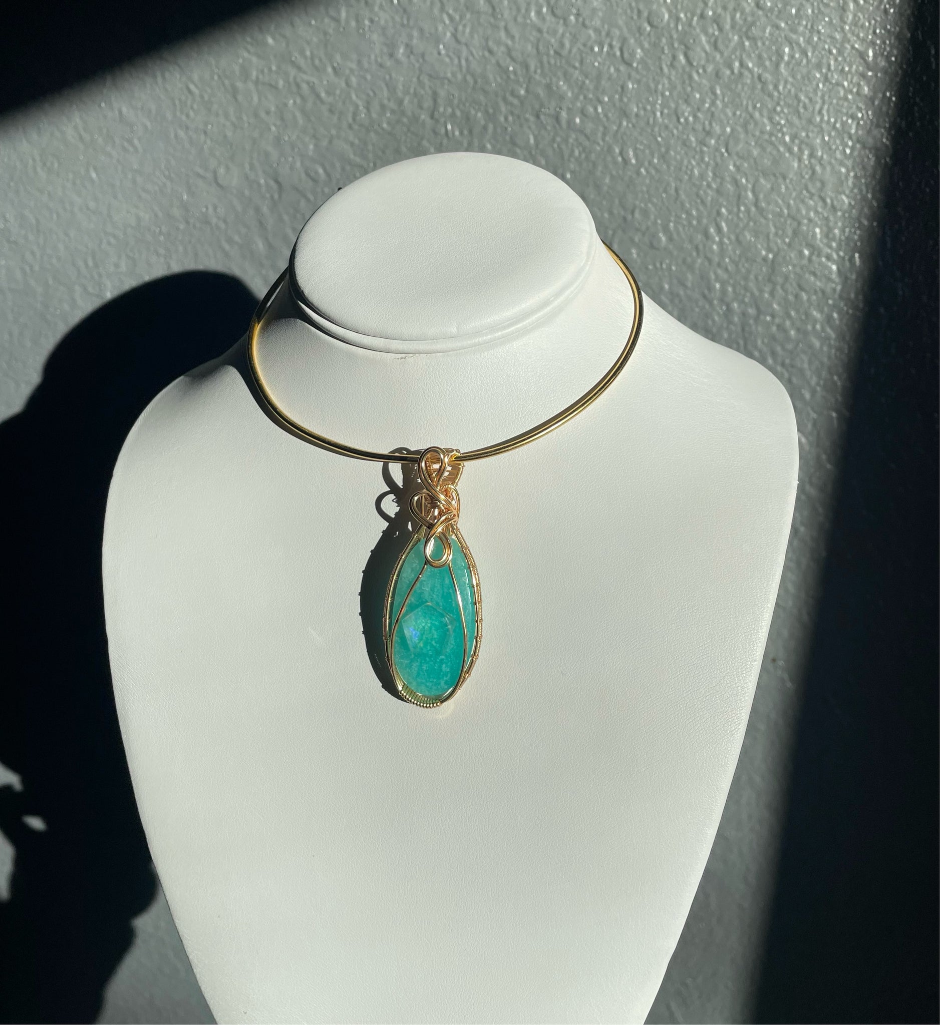 handmade adjustable choker and hand wire wrapped Amazonite & Aura Clear Quartz pendant