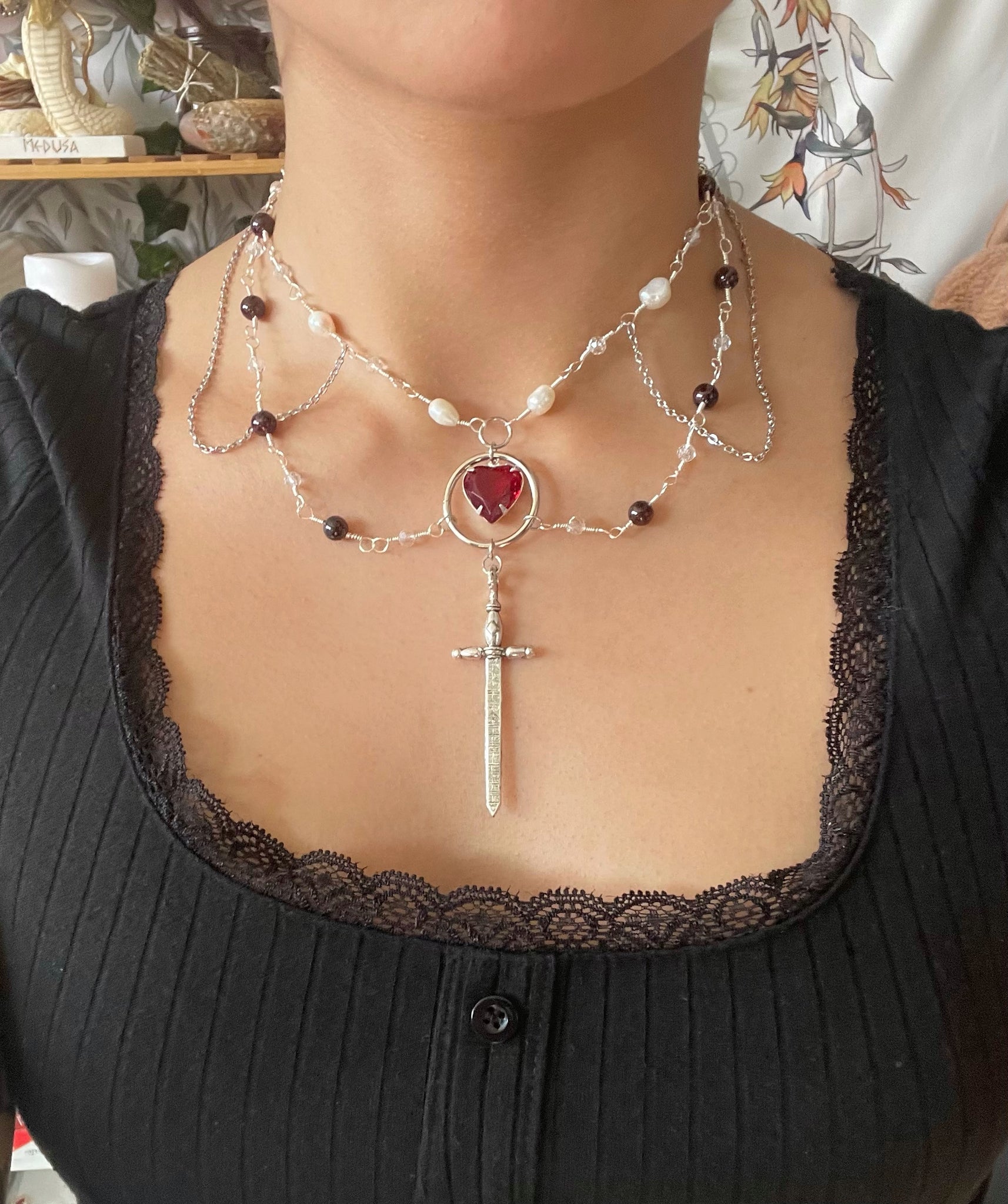 features a vintage glass heart pendant