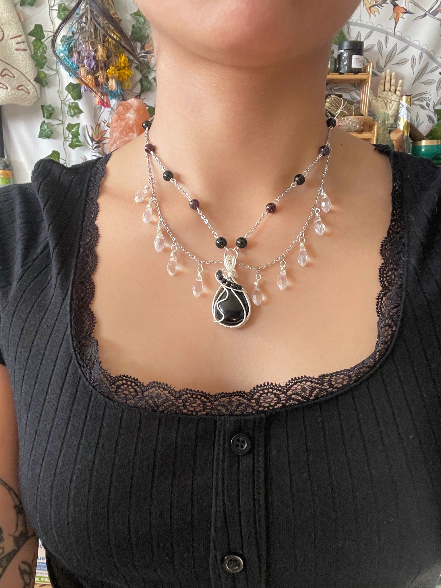 features a genuine black onyx and black tourmaline handmade pendant wire wrapped by me