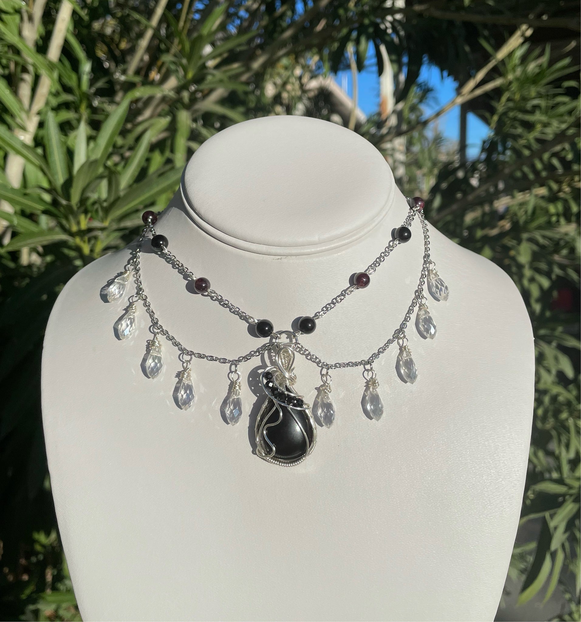 Handmade with genuine black onyx, black tourmaline, garnet, & Swarovski ab crystals