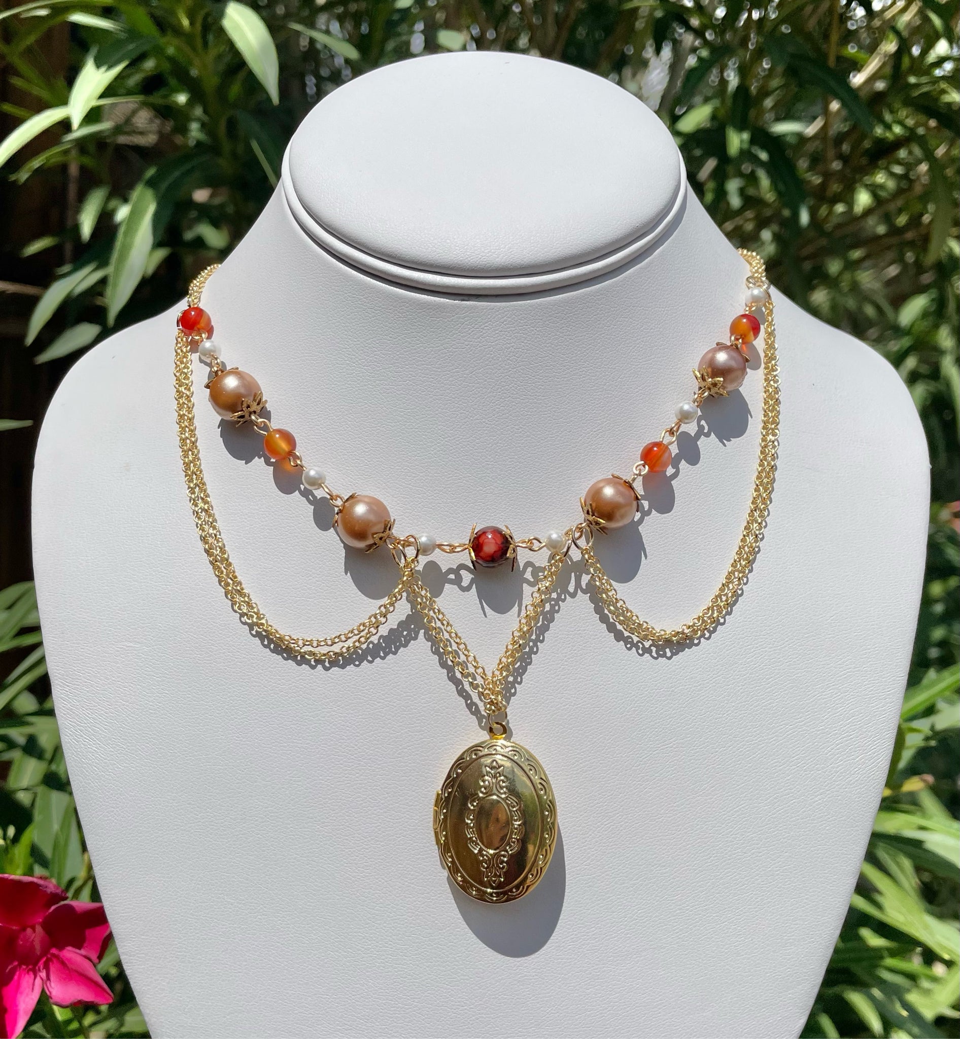 Hand beaded with genuine carnelian, mother of Pearls, and vintage beads
