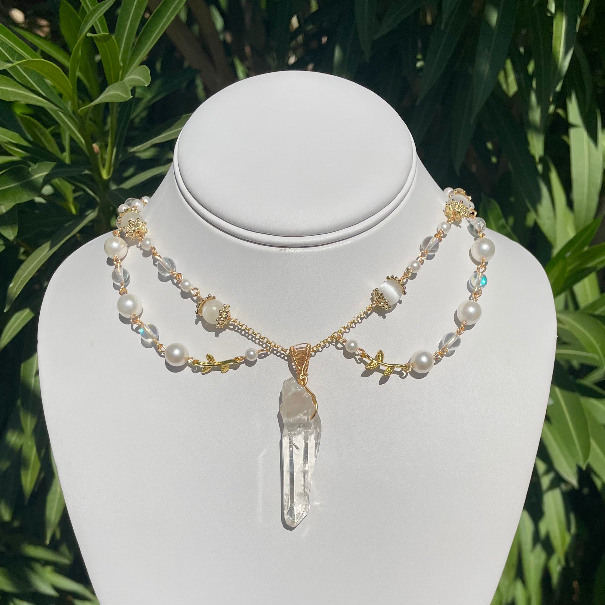 Handmade with genuine Clear Quartz, Satin Spar Selenite, Aura Quartz, and Mother of Pearls