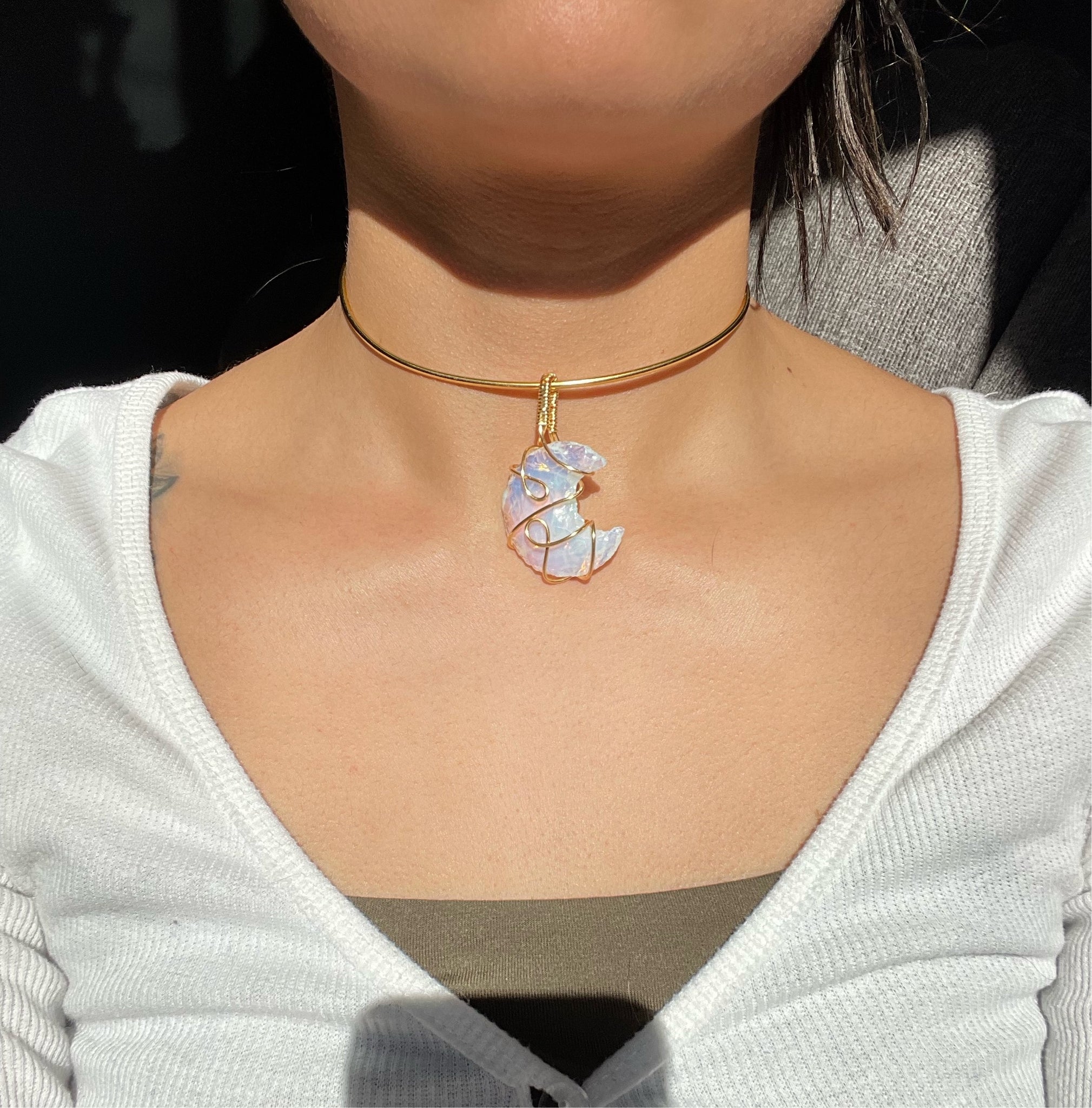 handmade adjustable choker and hand wire wrapped opalite moon pendant