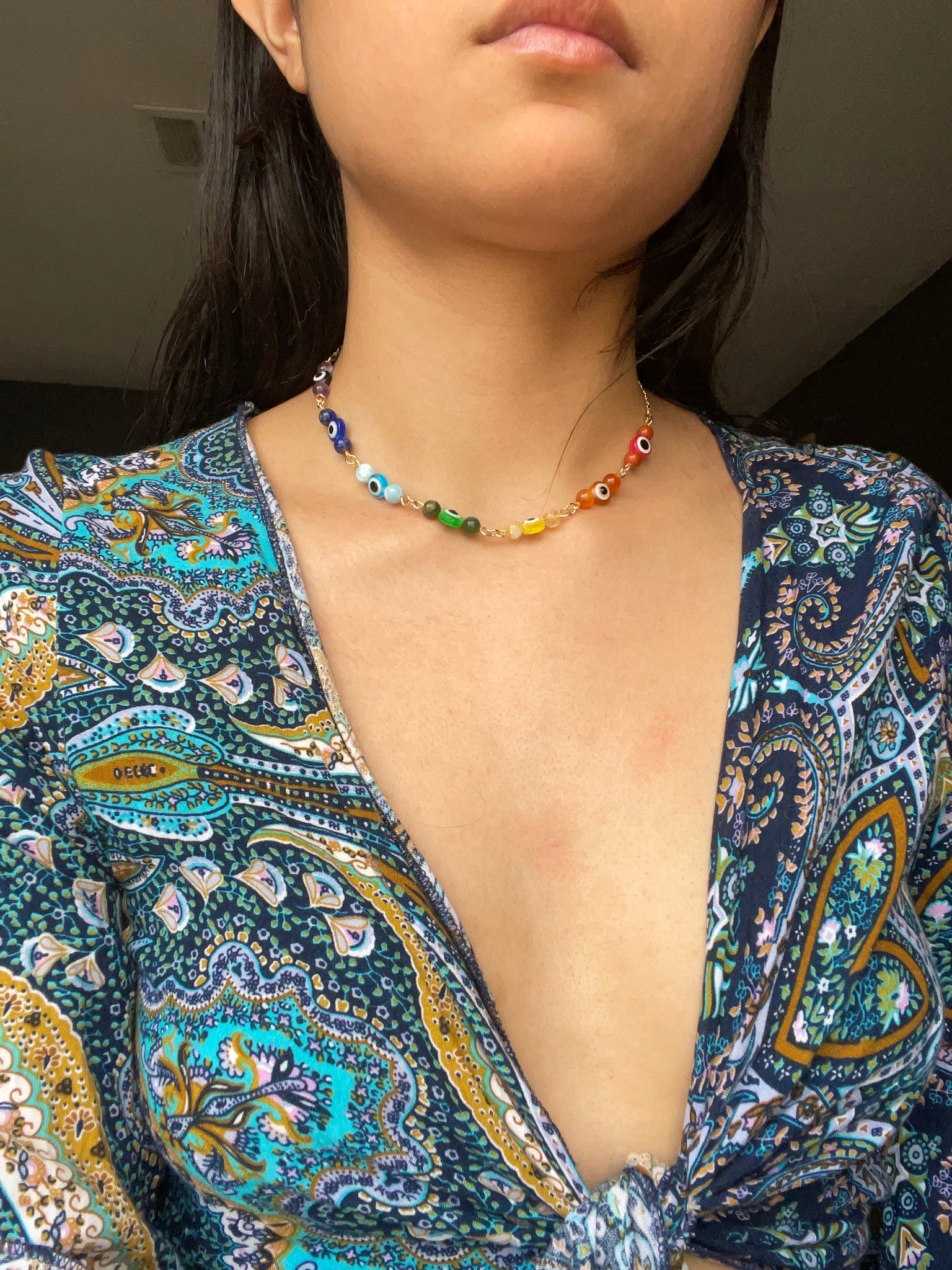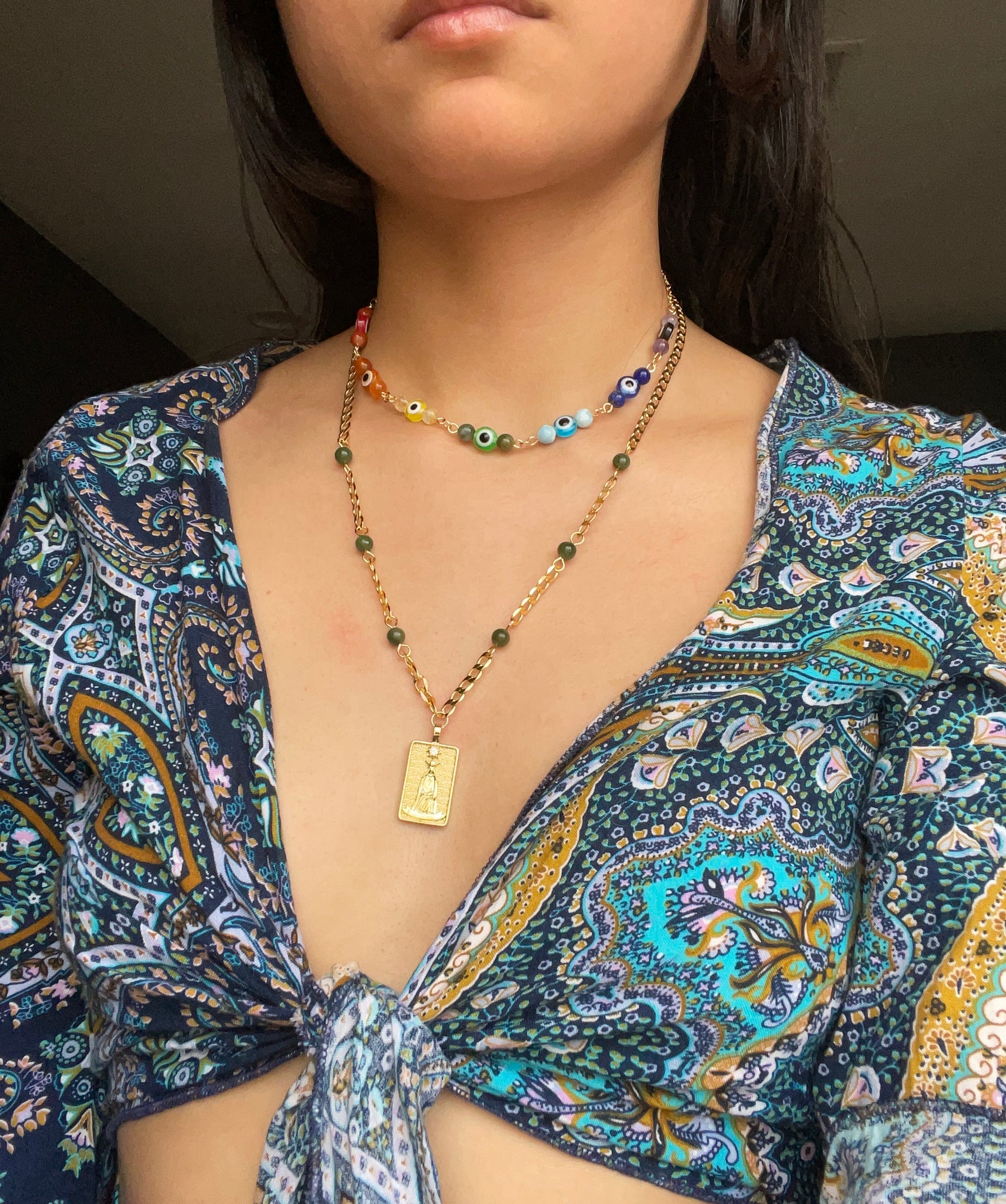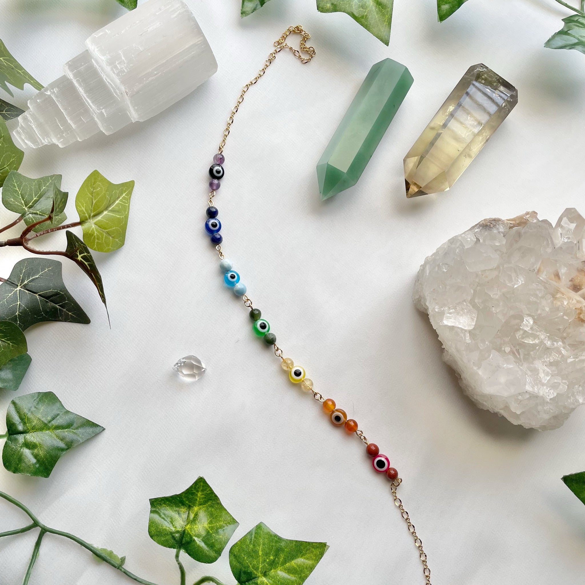 Features genuine and natural Red Jasper, Carnelian, Citrine, Green Jade, Larimar, Lapis Lazuli, Amethyst, & Evil Eye Beads