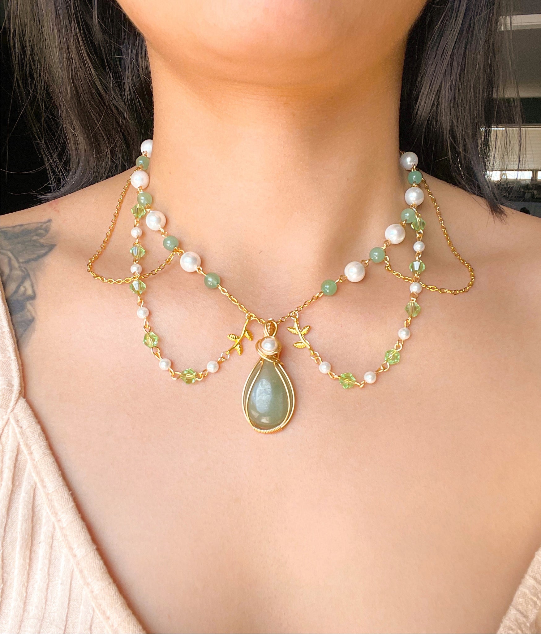 featuring a genuine hand wire wrapped grade A Green Aventurine and Mother of Pearl pendant handmade by me