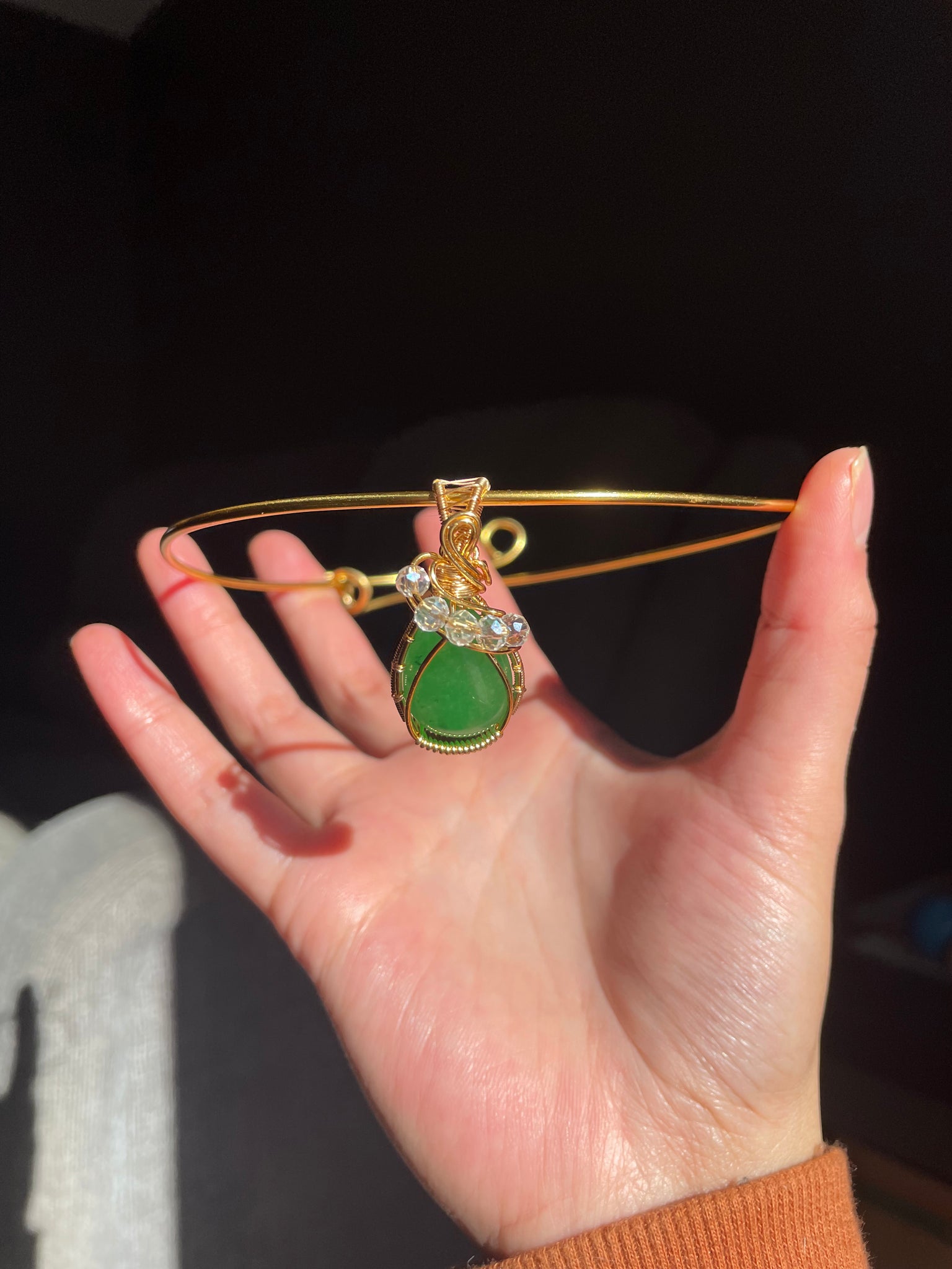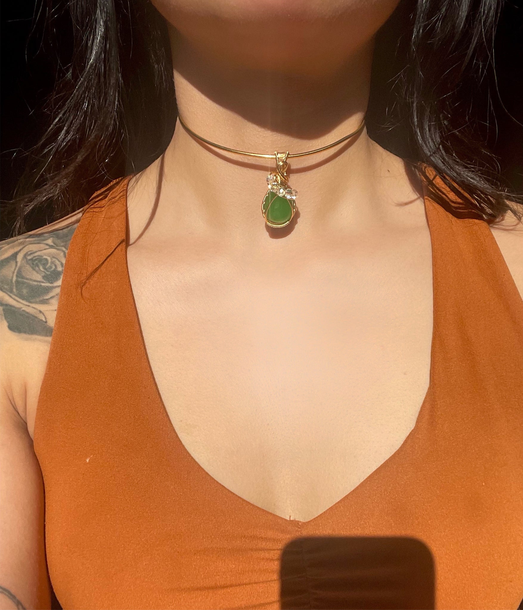 Adjustable handmade choker made with tarnish resistant jewelry wire featuring a Green Jade & Swarovski crystal pendant hand wire wrapped by me