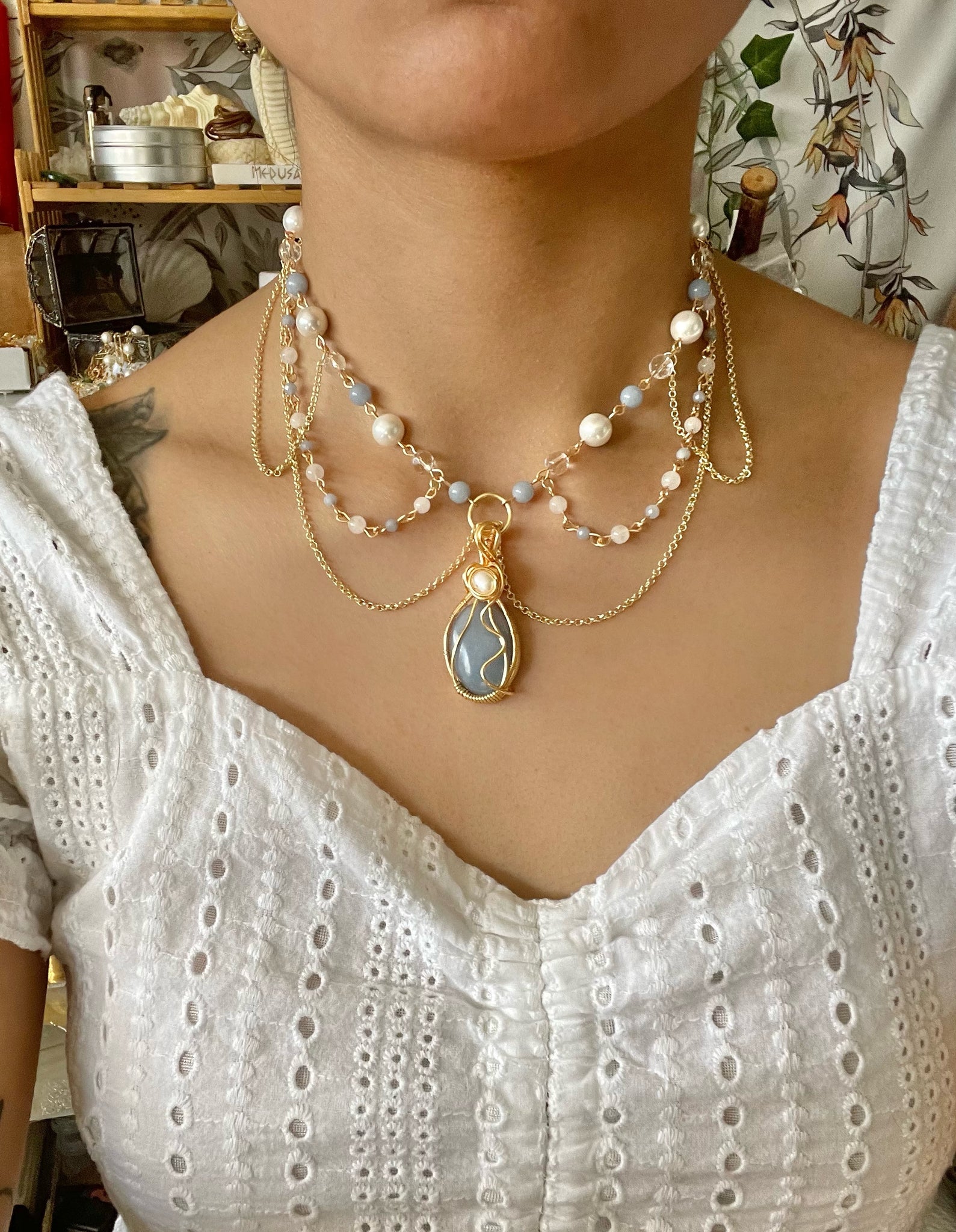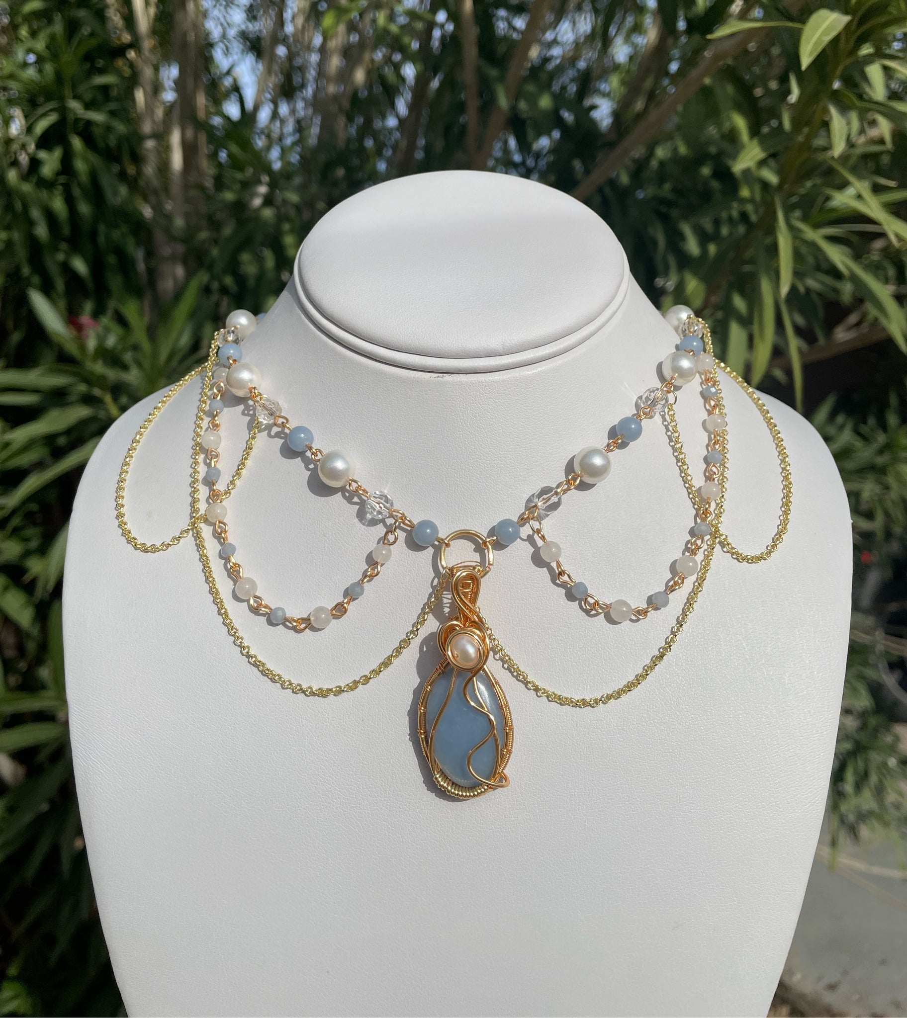 features a handmade genuine angelite and fresh water pearl pendant wire wrapped by me