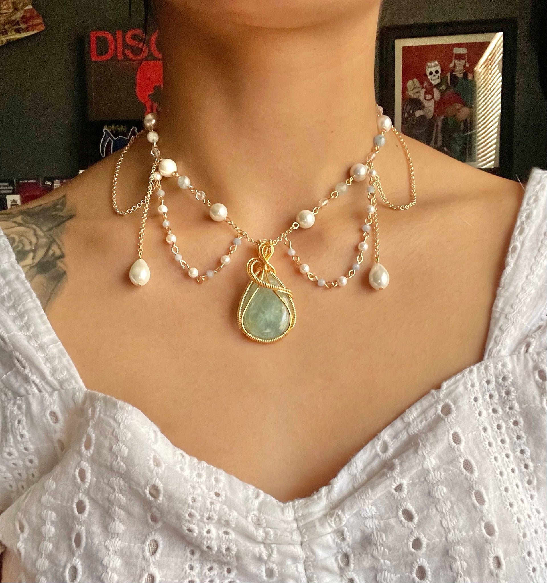 Handmade with genuine Aquamarine, Angelite, Clear Quartz & Mother of Pearls