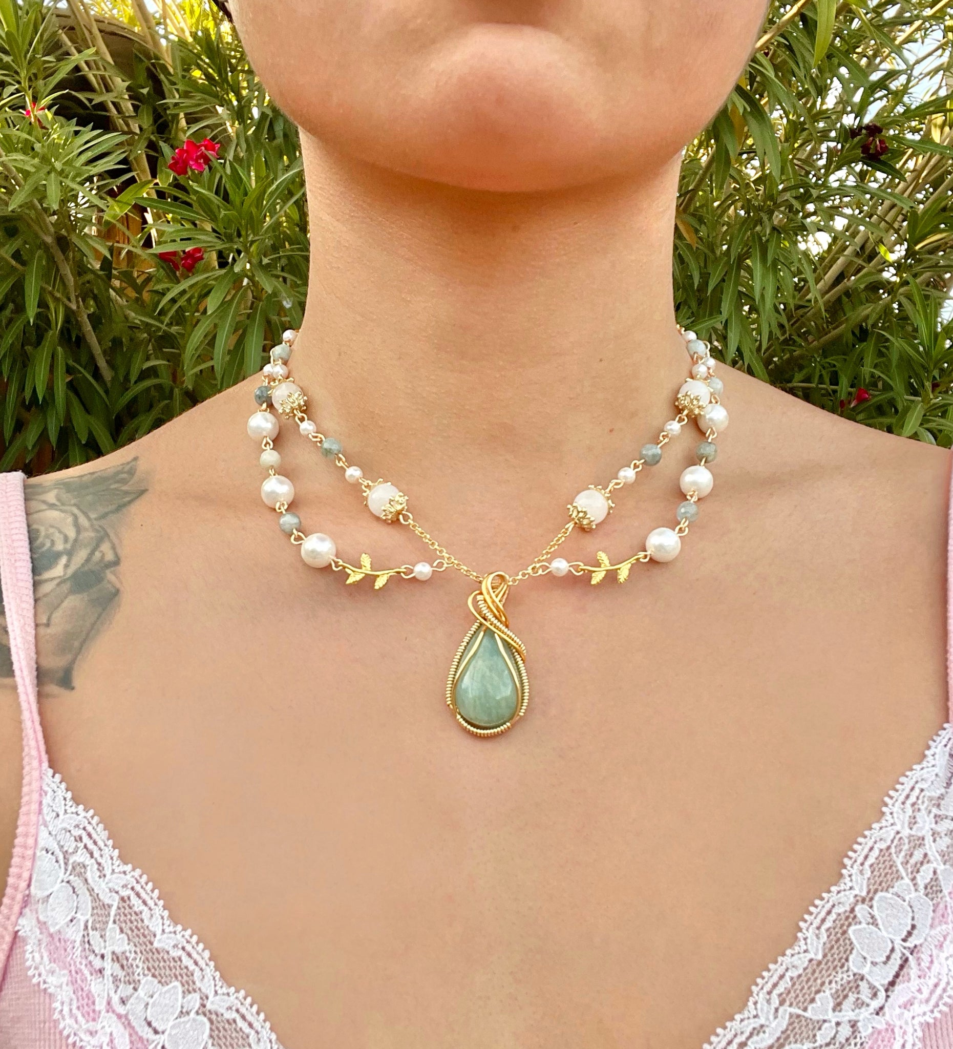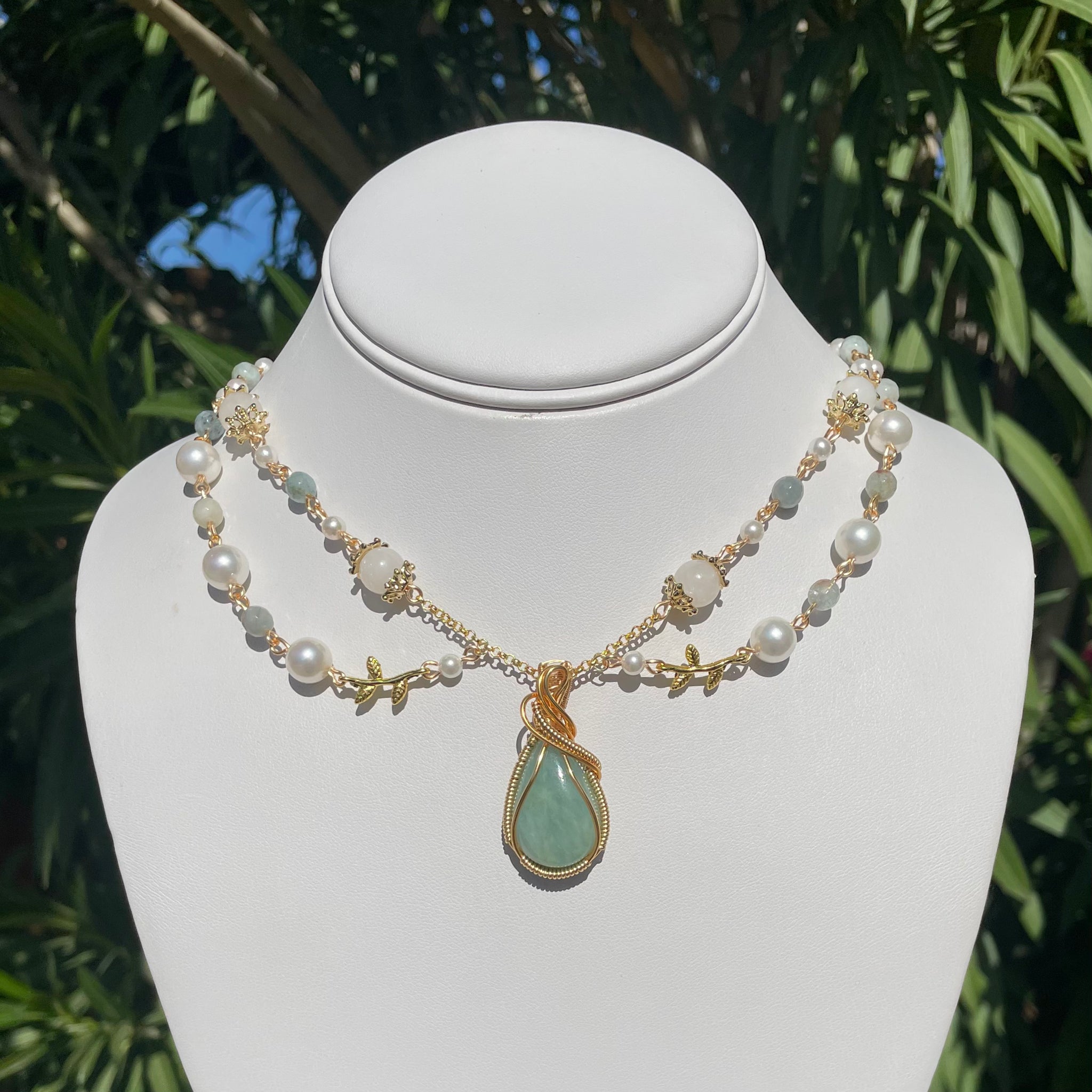 Handmade with genuine Aquamarine, White Jade, and Mother of Pearls