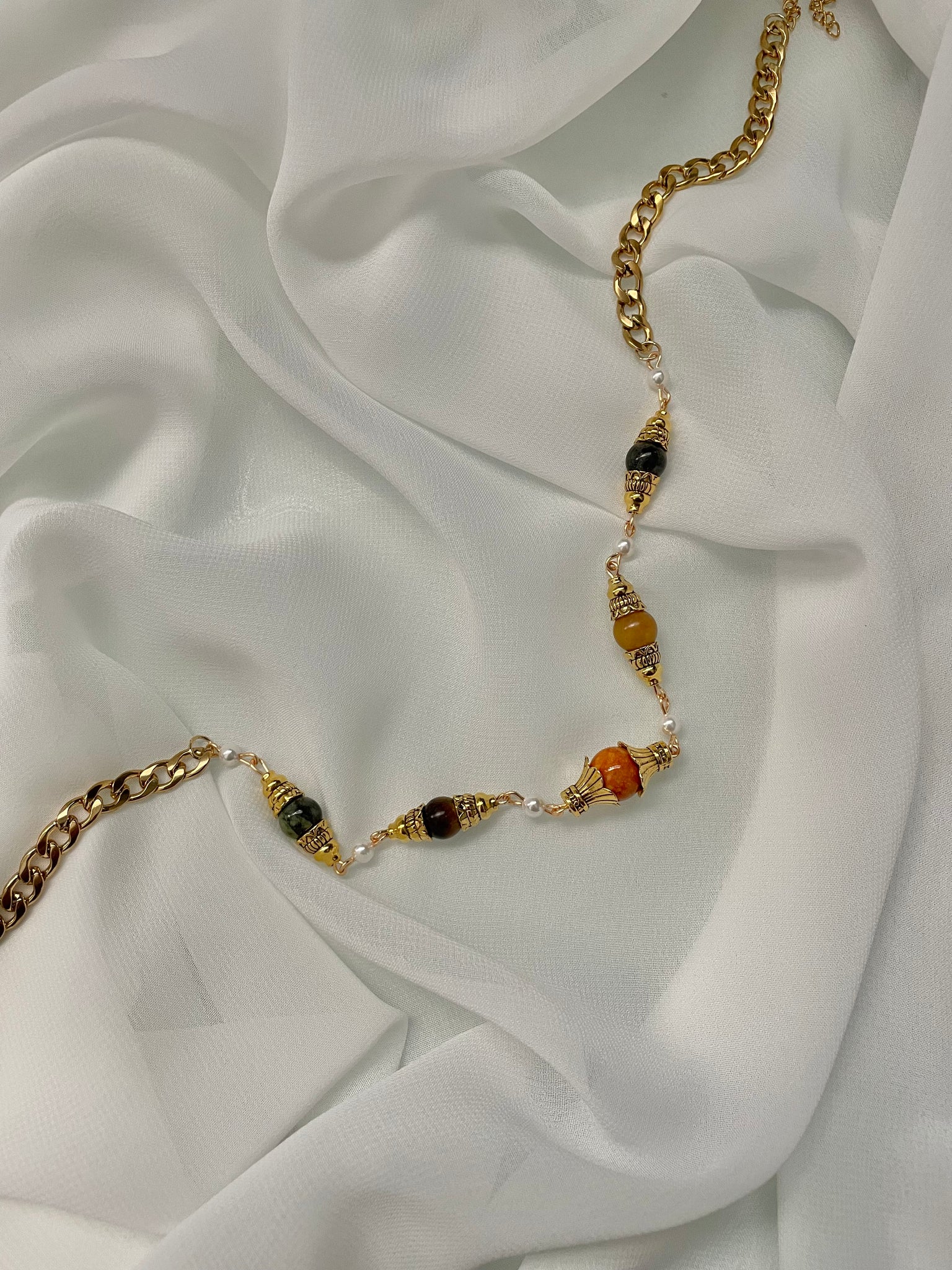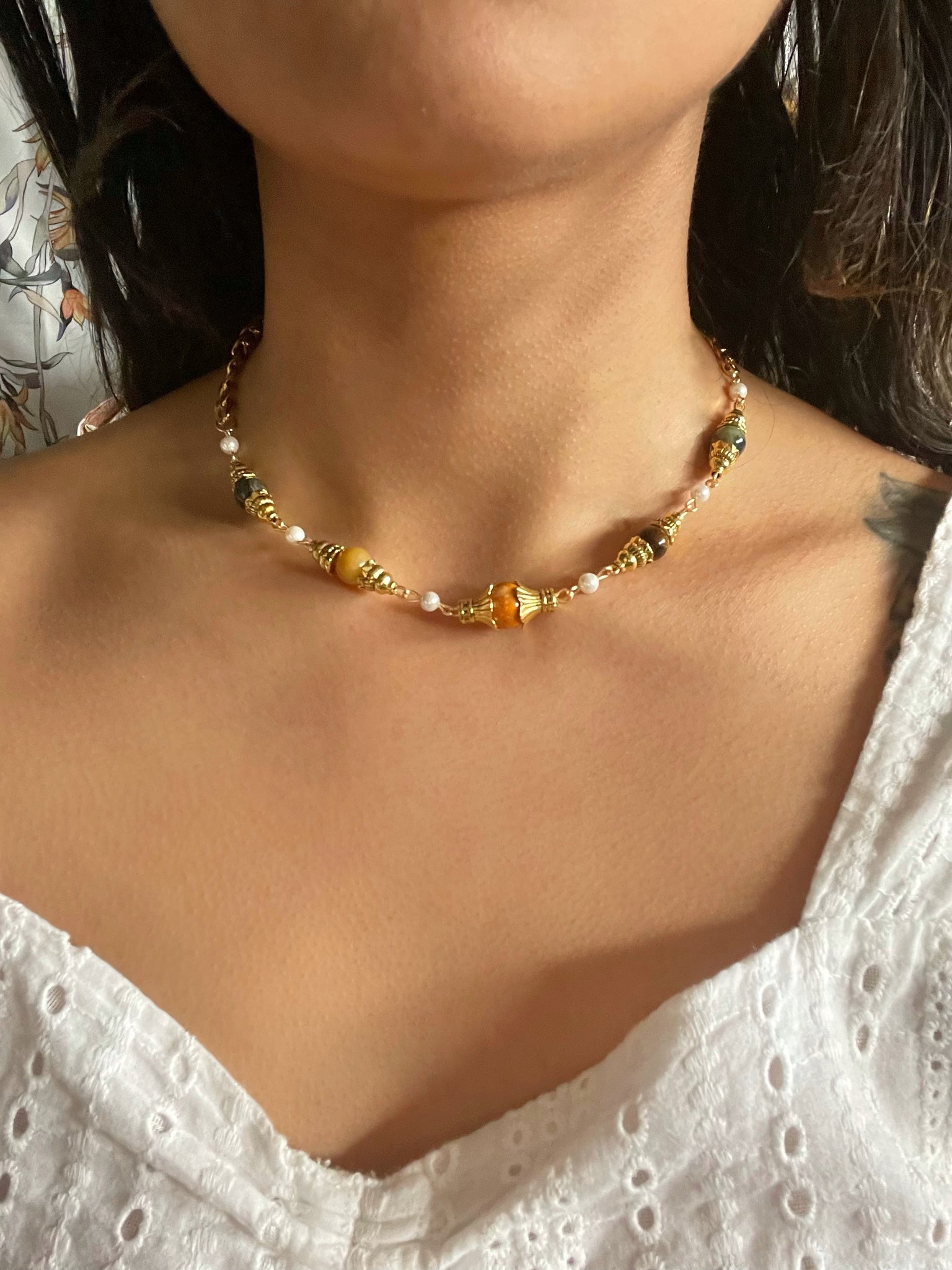 Hand beaded with vintage gold beads, genuine nephrite jade, yellow jade, fossil stone, tigers eye, and mother of pearls