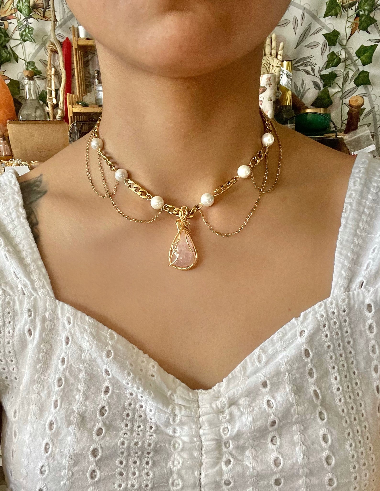 features a handmade genuine rose quartz pendant wire wrapped by me