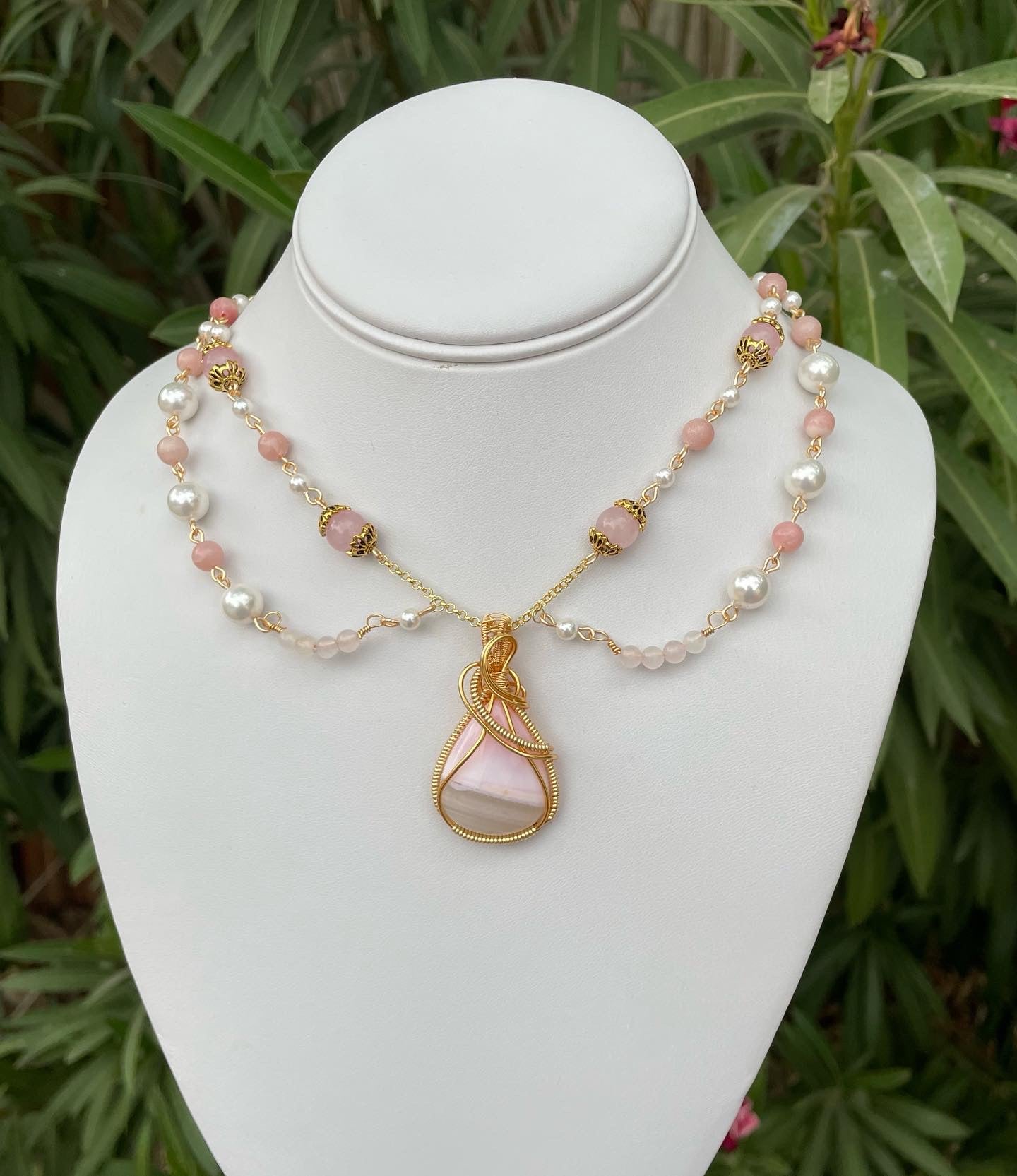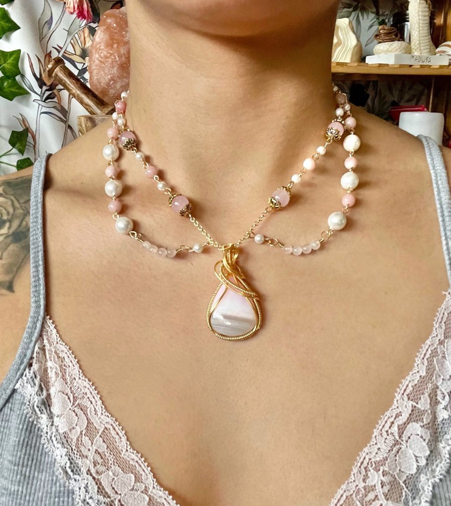 Handmade with genuineĀ Pink Opal, Rose Quartz, White Jade, & Mother of PearlsĀ