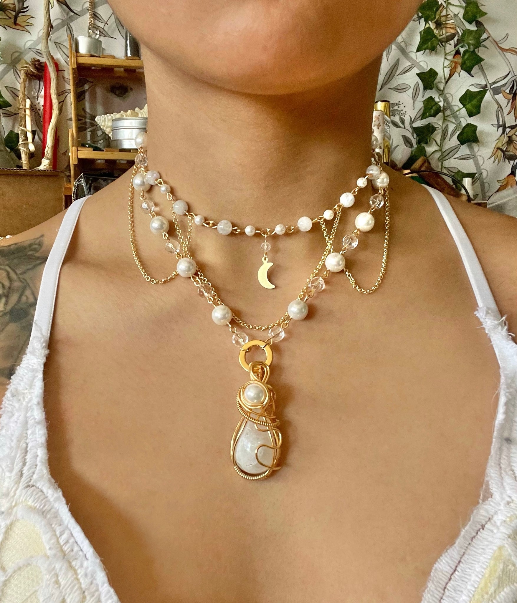 Features a genuine Rainbow Moonstone w/ pearlĀ pendant wire wrappedĀ by meĀ