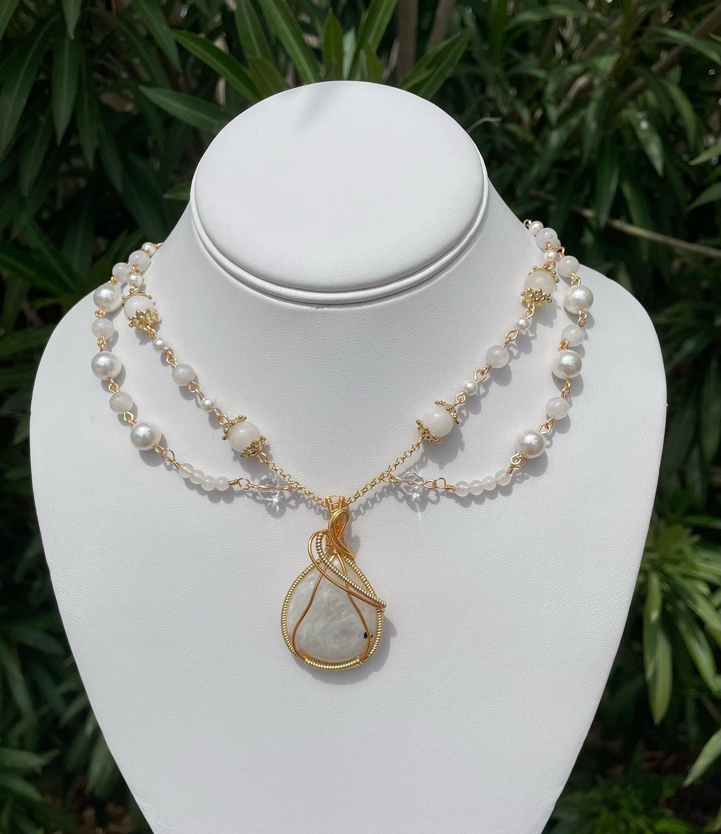 Handmade with genuine Rainbow Moonstone, White Jade, & Mother of Pearls