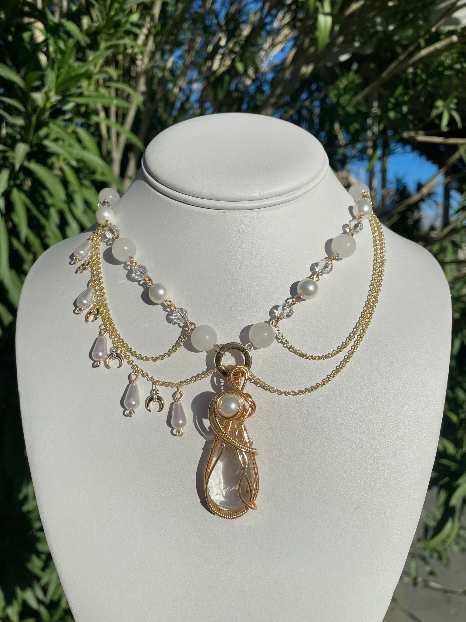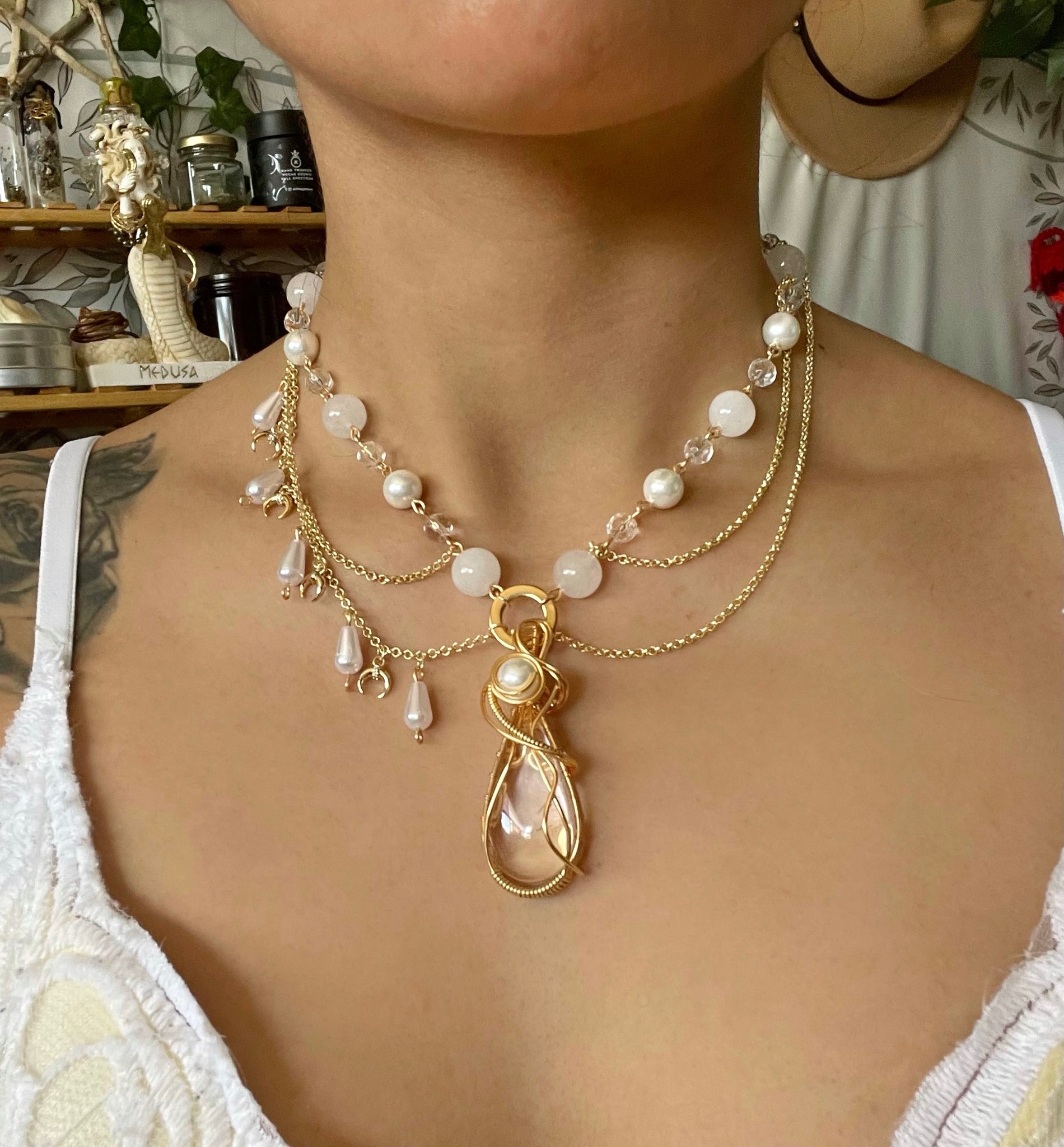 features a genuine clear quartz with pearl pendant handmade by me