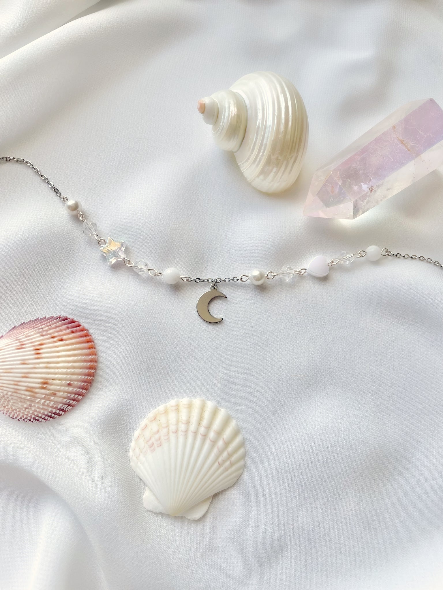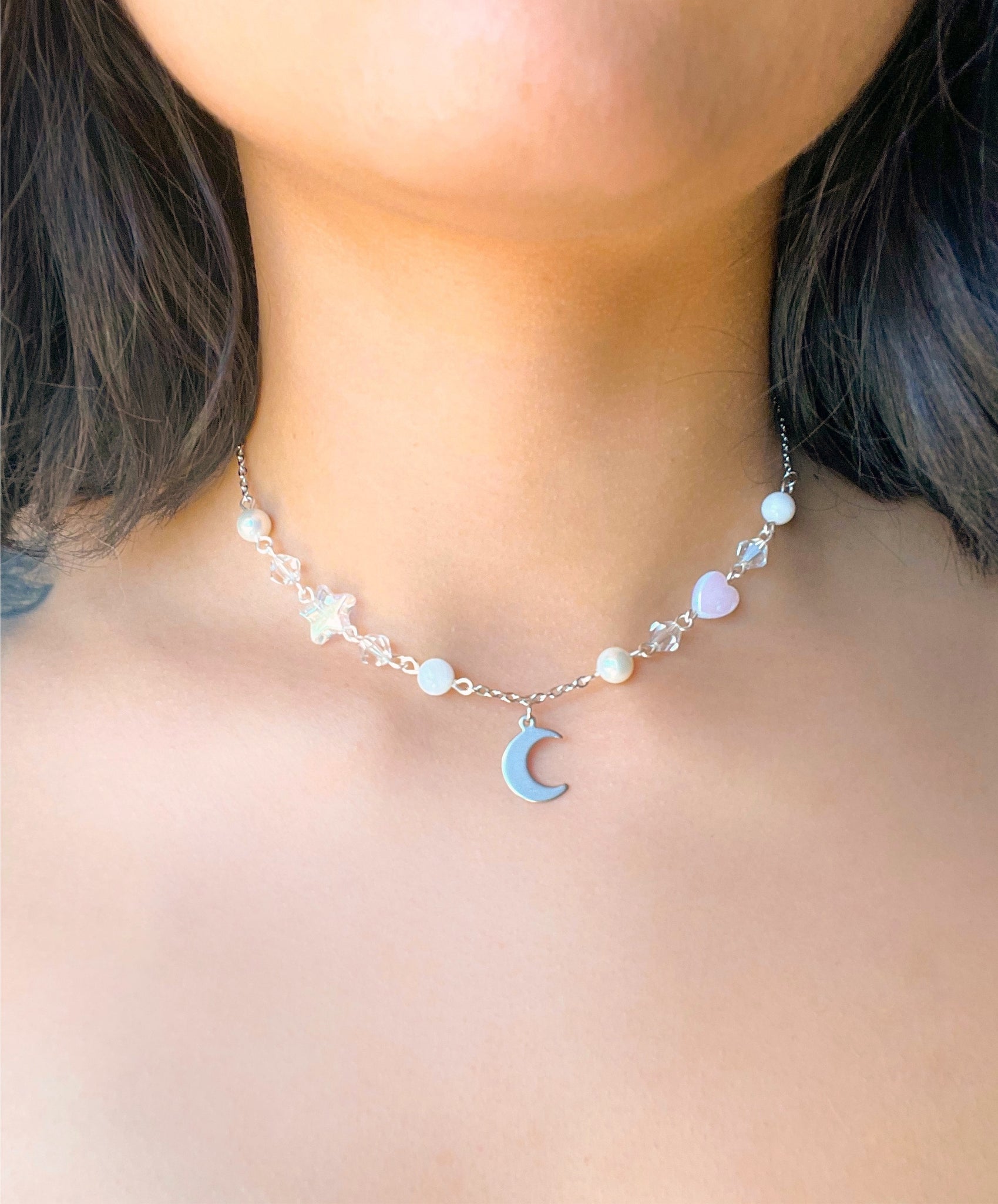 Features genuine moonstone crystals, mother of pearls, a stainless steel moon charm, and aura beads, and faceted glass beads
