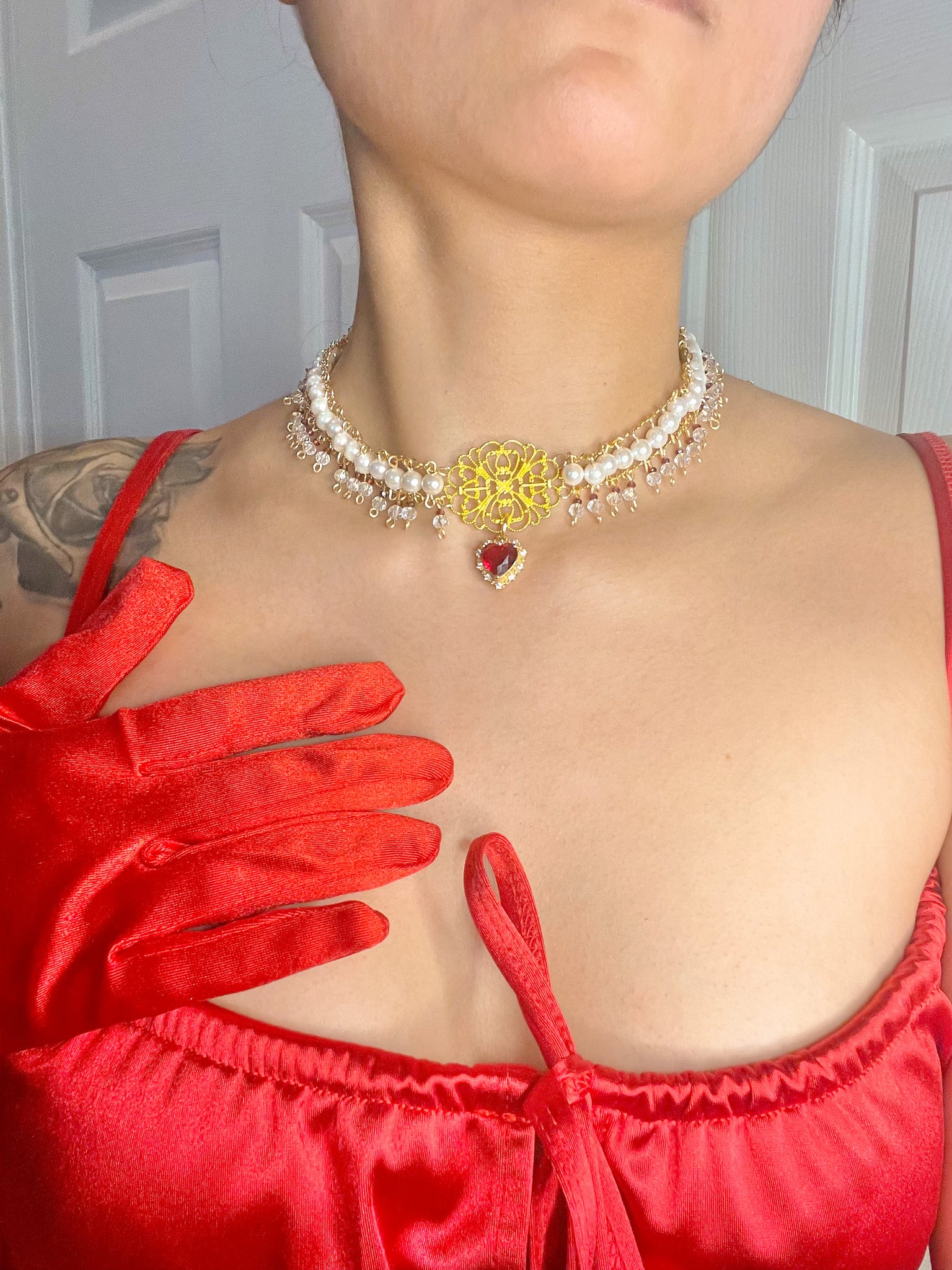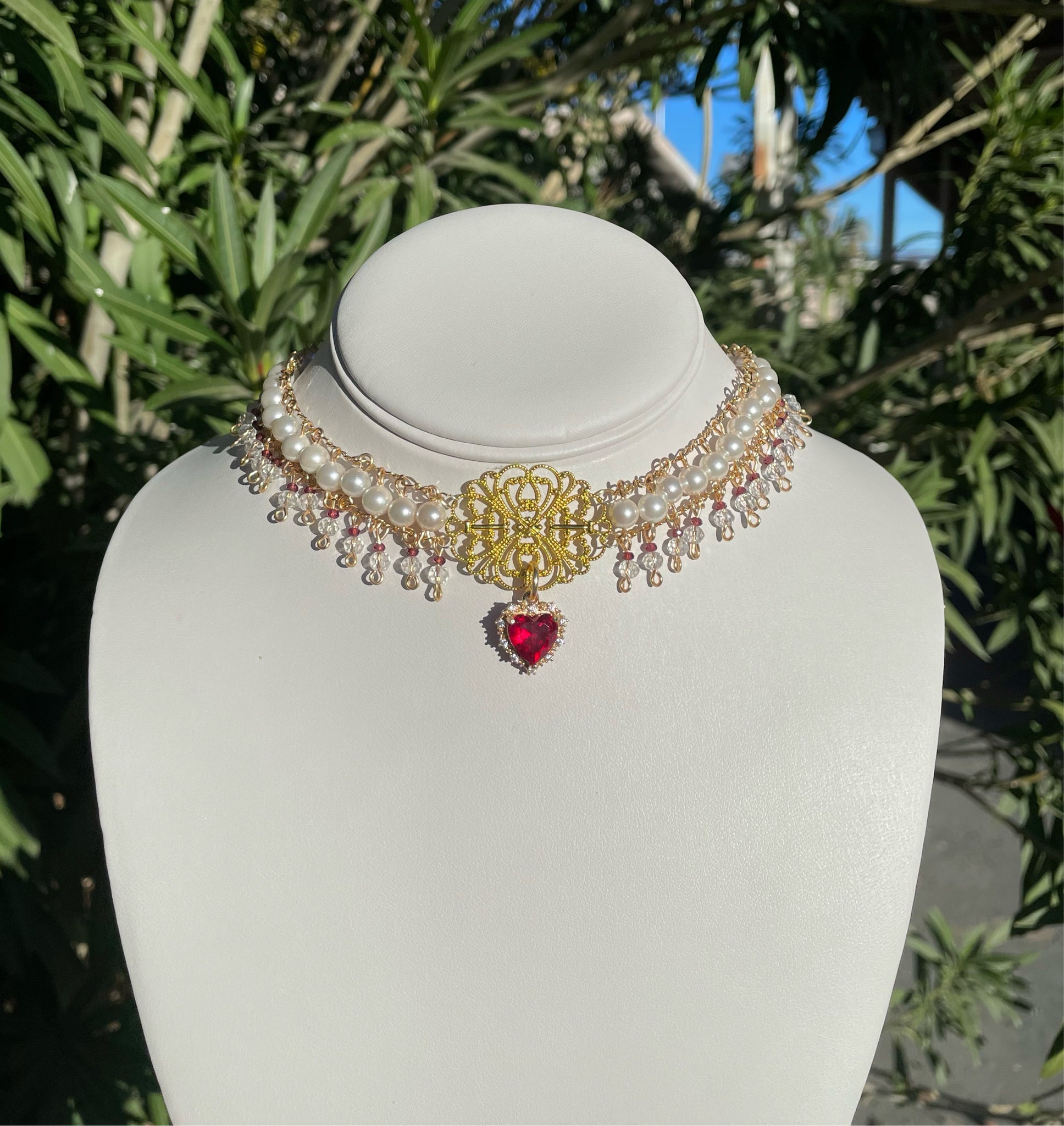 Handmade with genuine mother of pearls, garnet, and Swarovski ab crystals