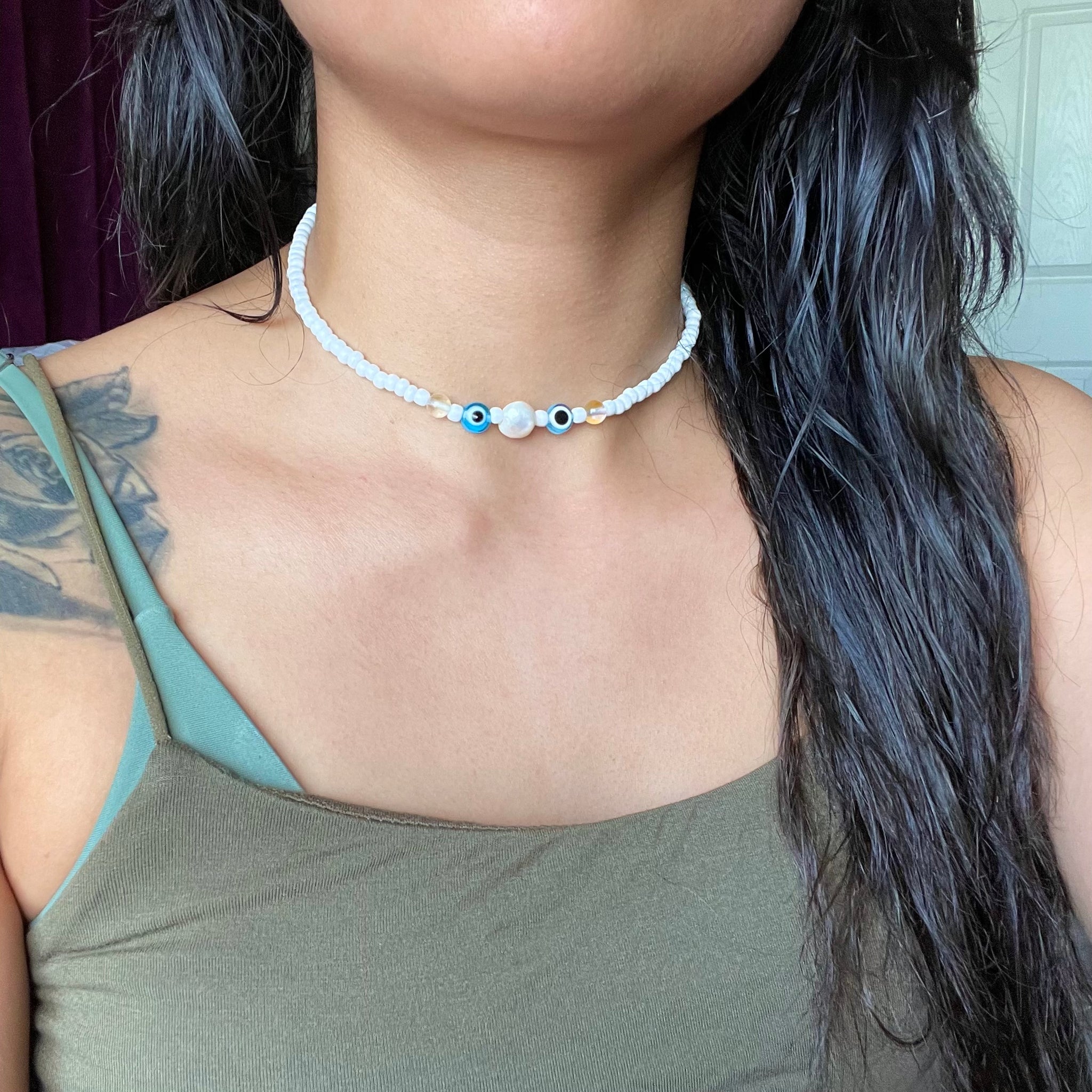 Features genuine aura quartz crystals and a grade AAA fresh water pearl