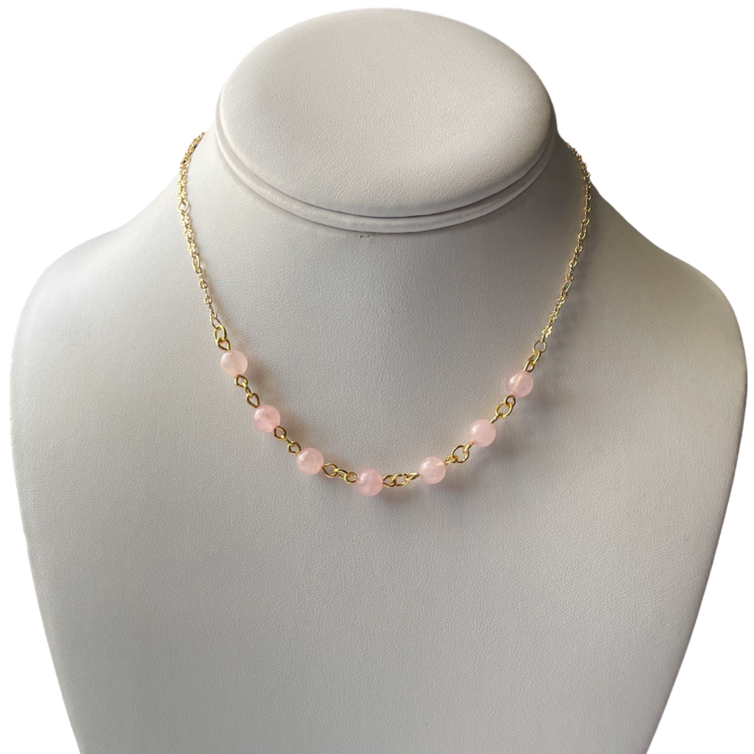 Features genuine and natural grade A rose quartz stones handcrafted with tarnish resistant jewelry wire and 18k gold plated hardware 14”-16” adjustable chain nickel free lead free Rose Quartz is the universal stone of love. It restores trust and...Read more