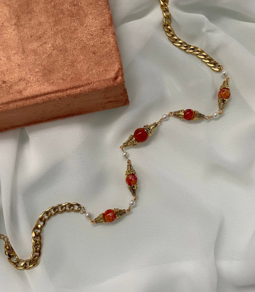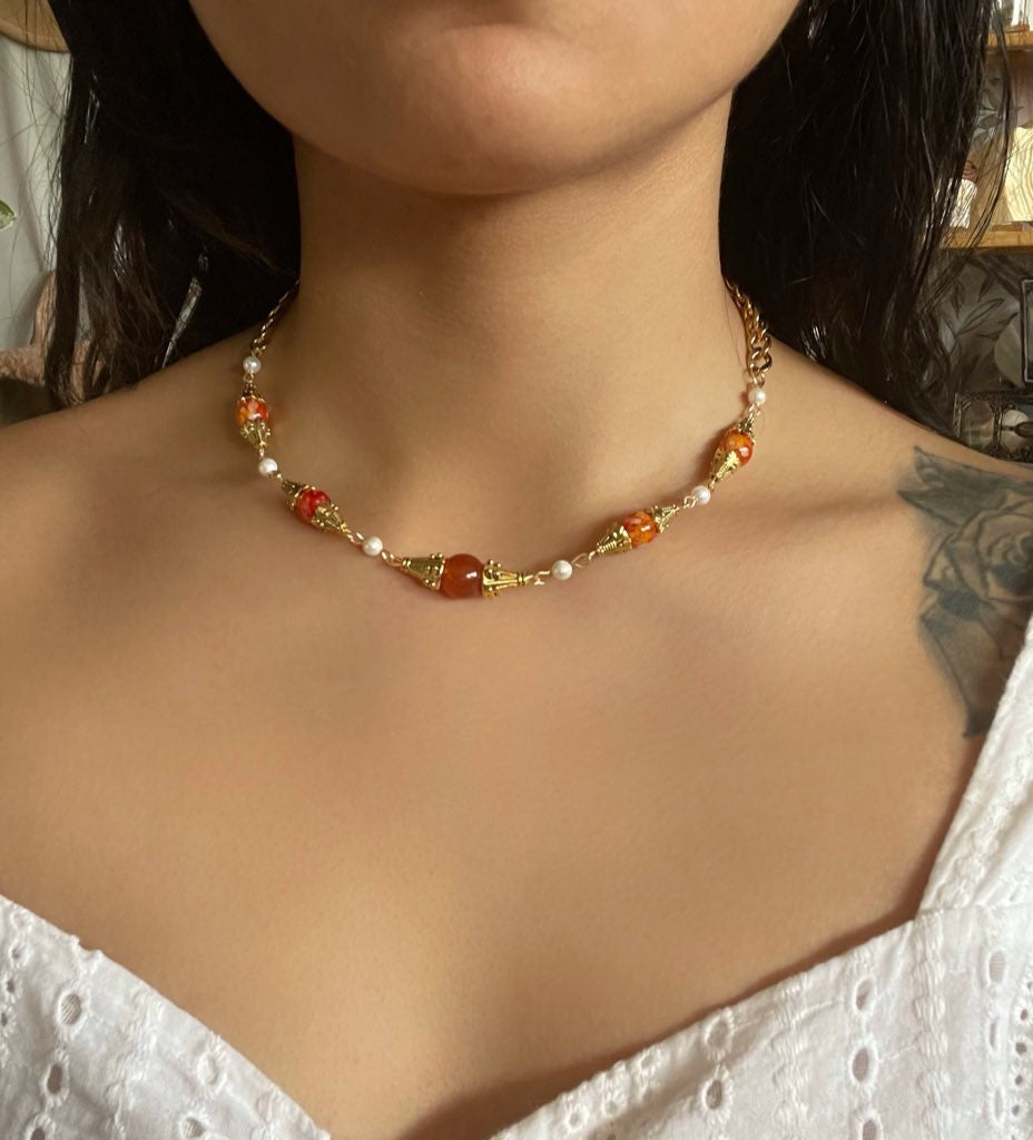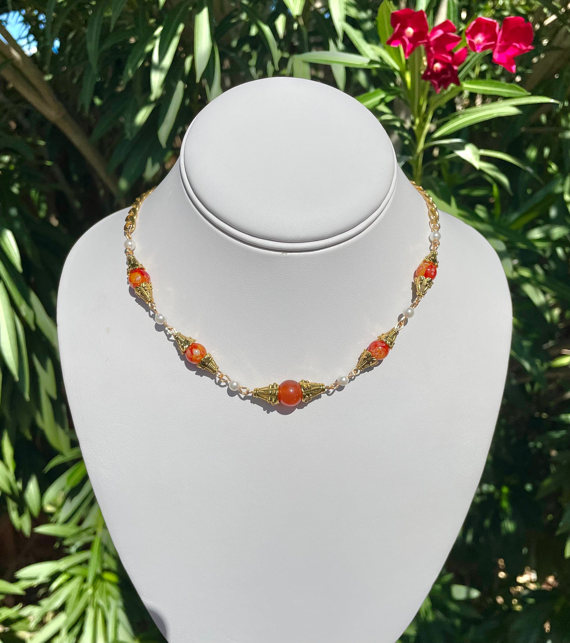 Hand beaded with genuine mother of Pearl, orange jade, and vintage beads