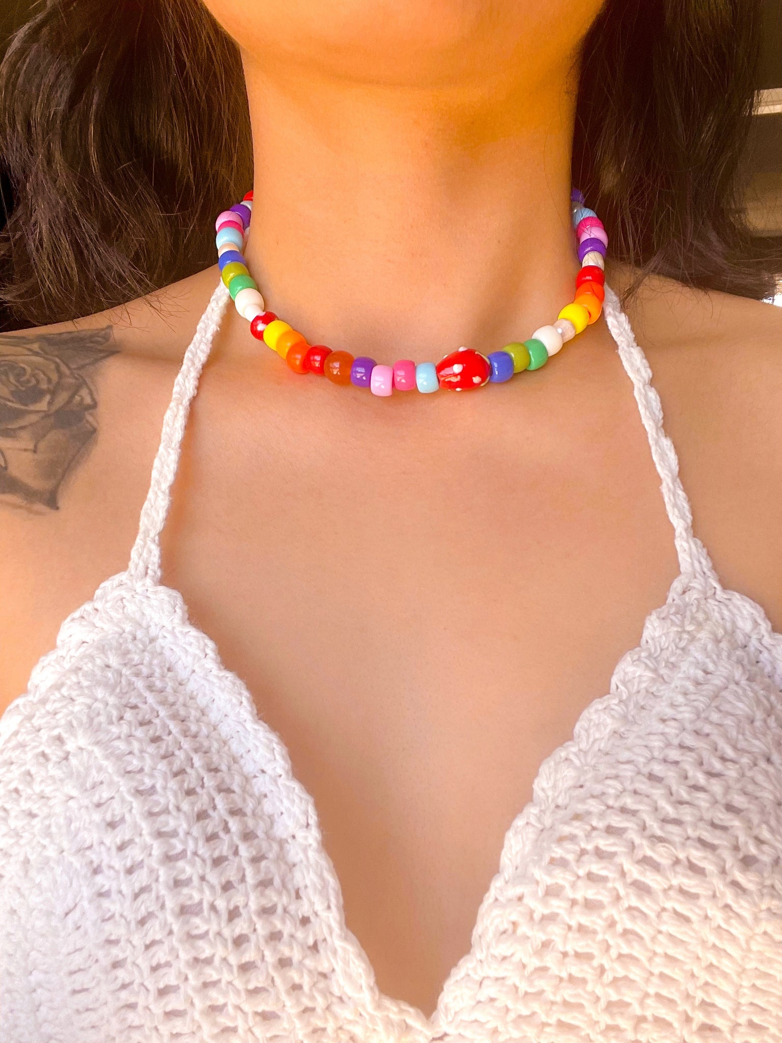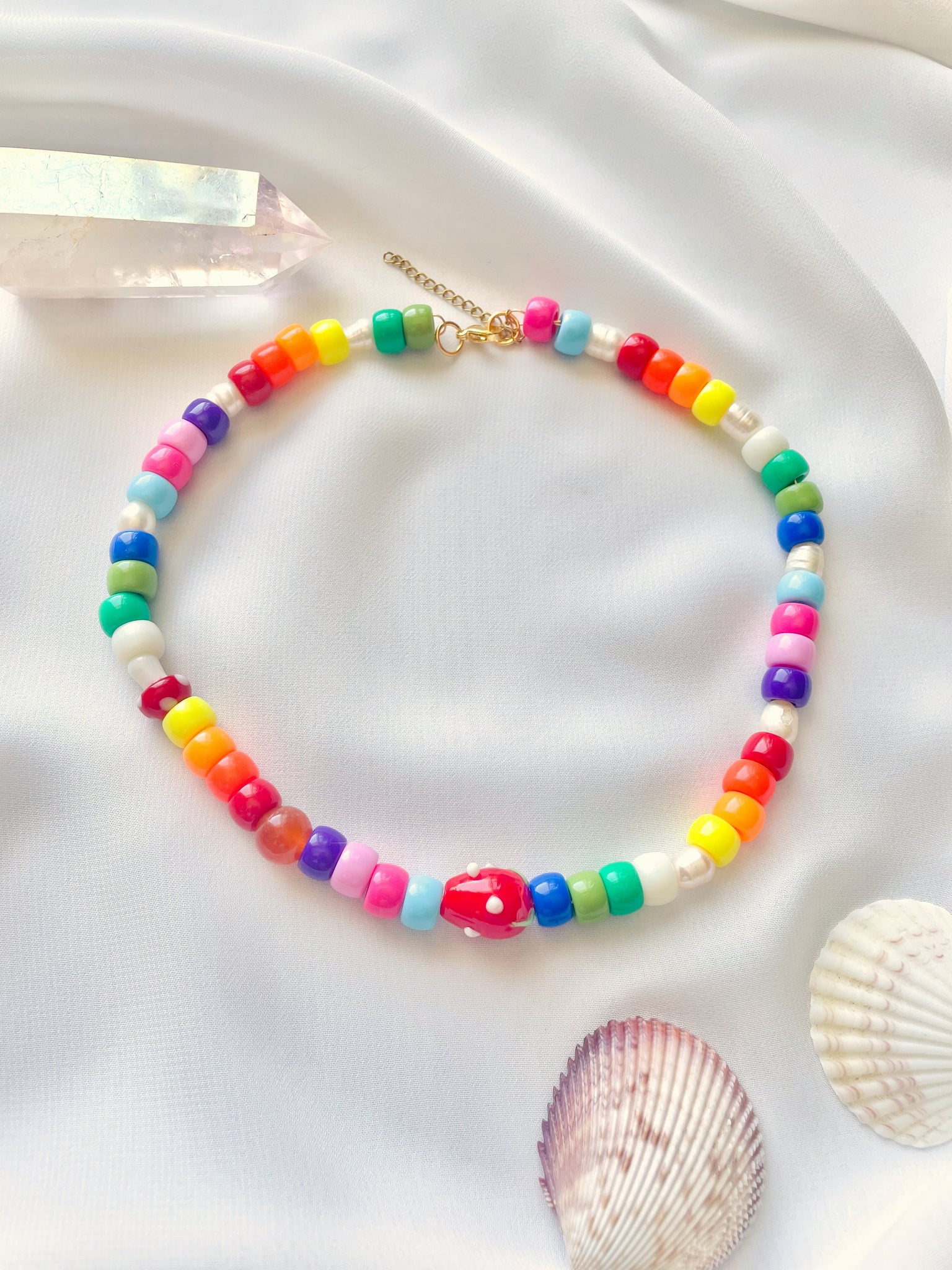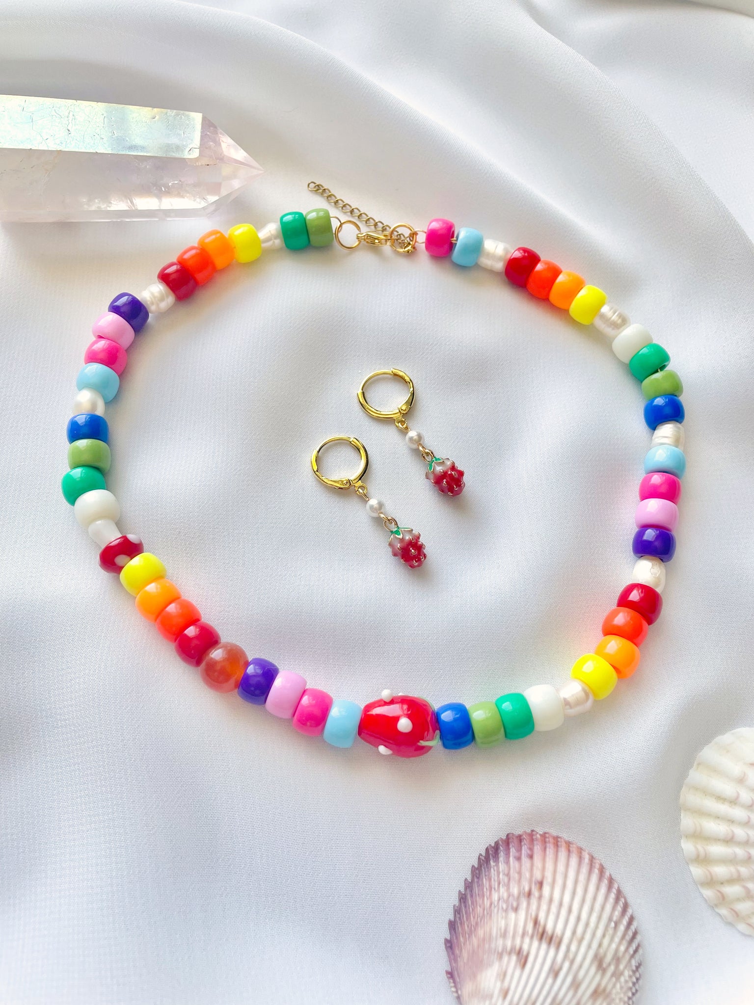 Features genuine fresh water pearls, orange jade, glass strawberry, & glass mushroom 🍓🍄