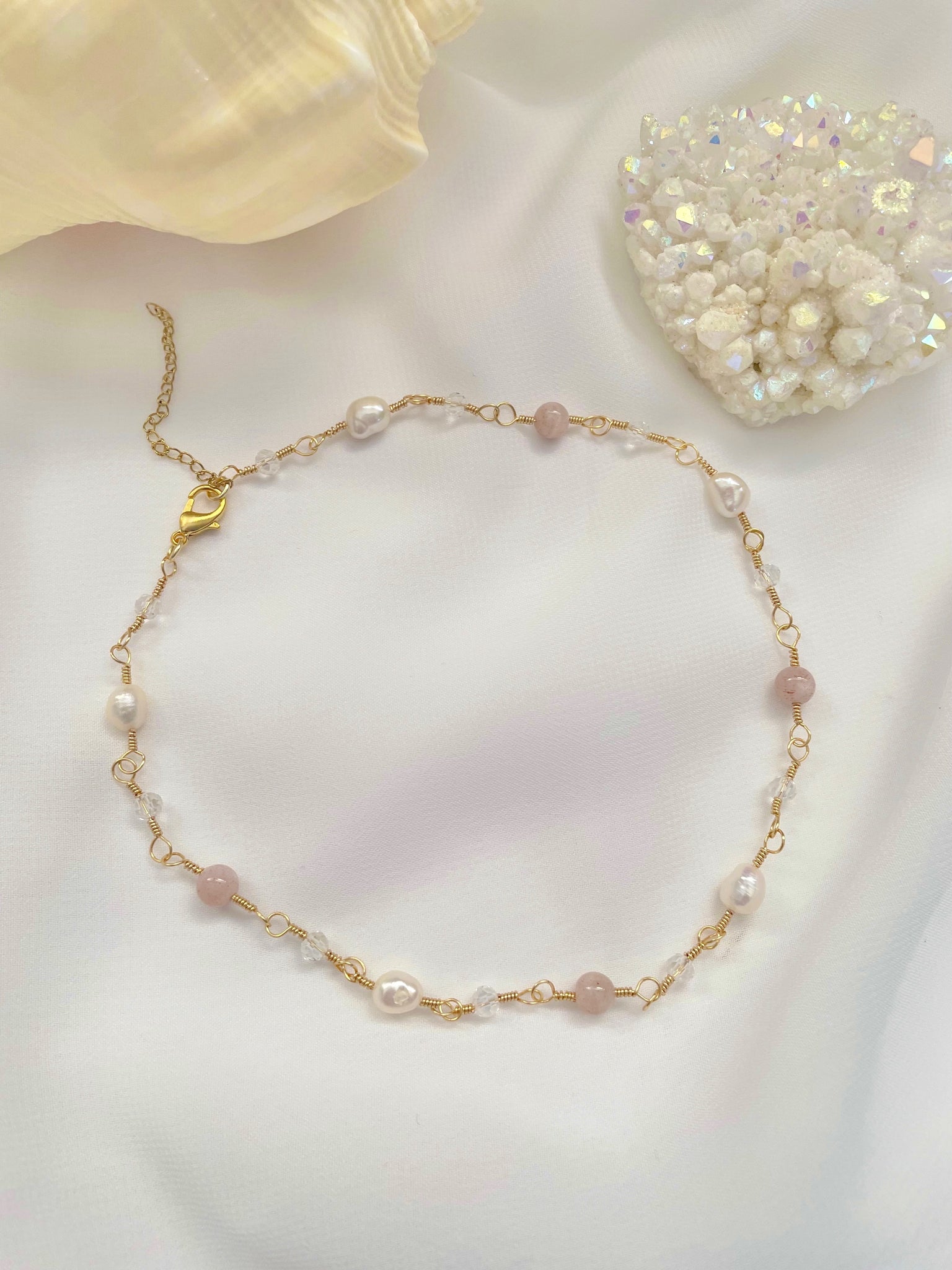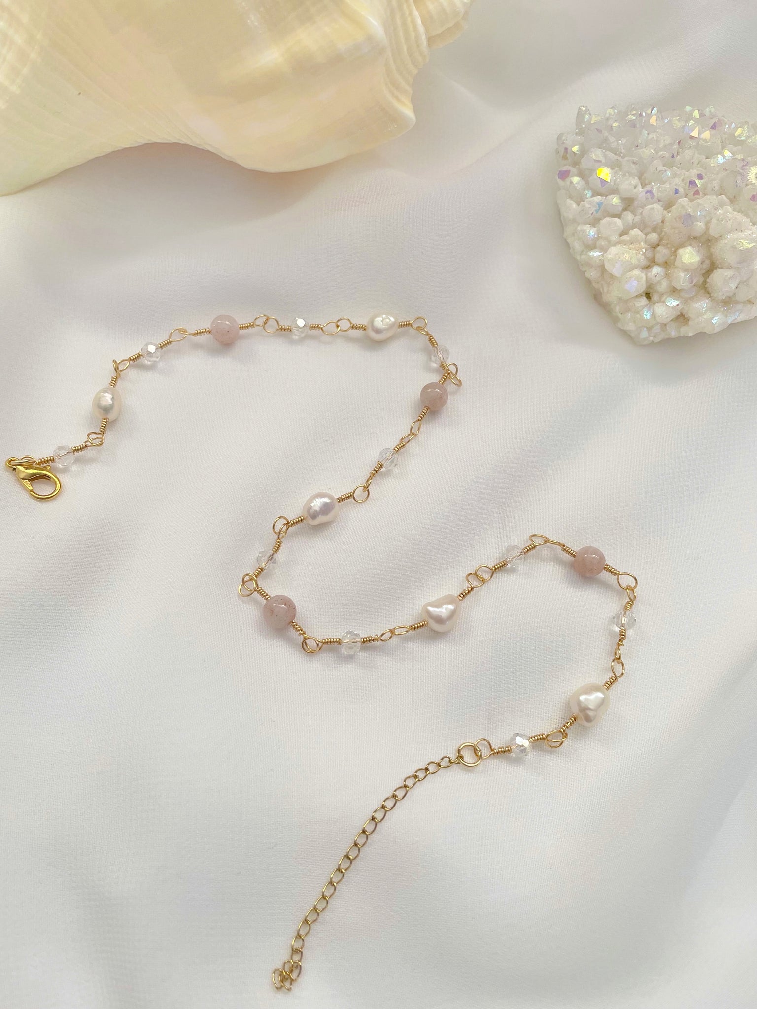features genuine and natural Sunstone crystals, grade aaa fresh water pearls, and swarovski crystals