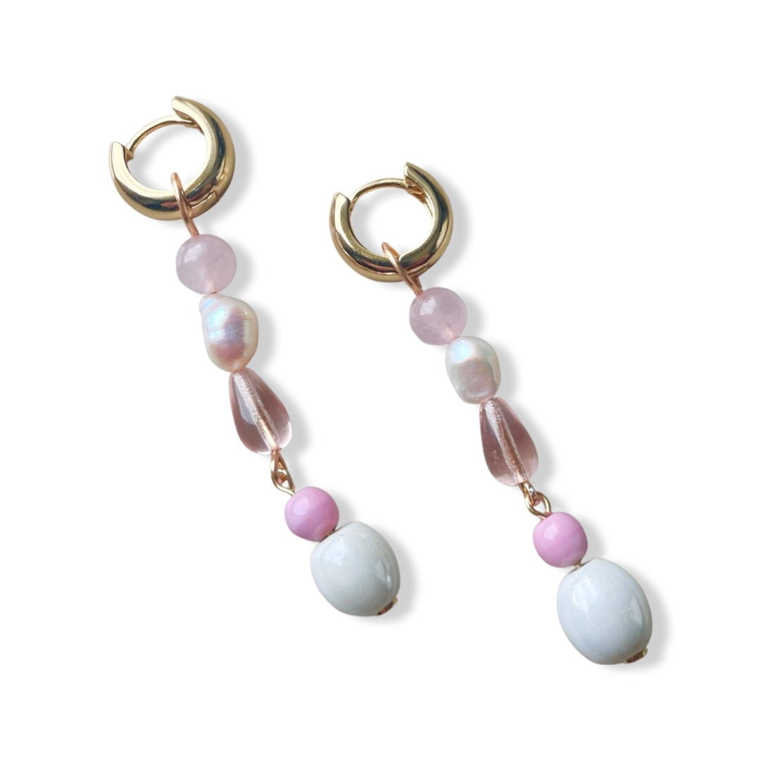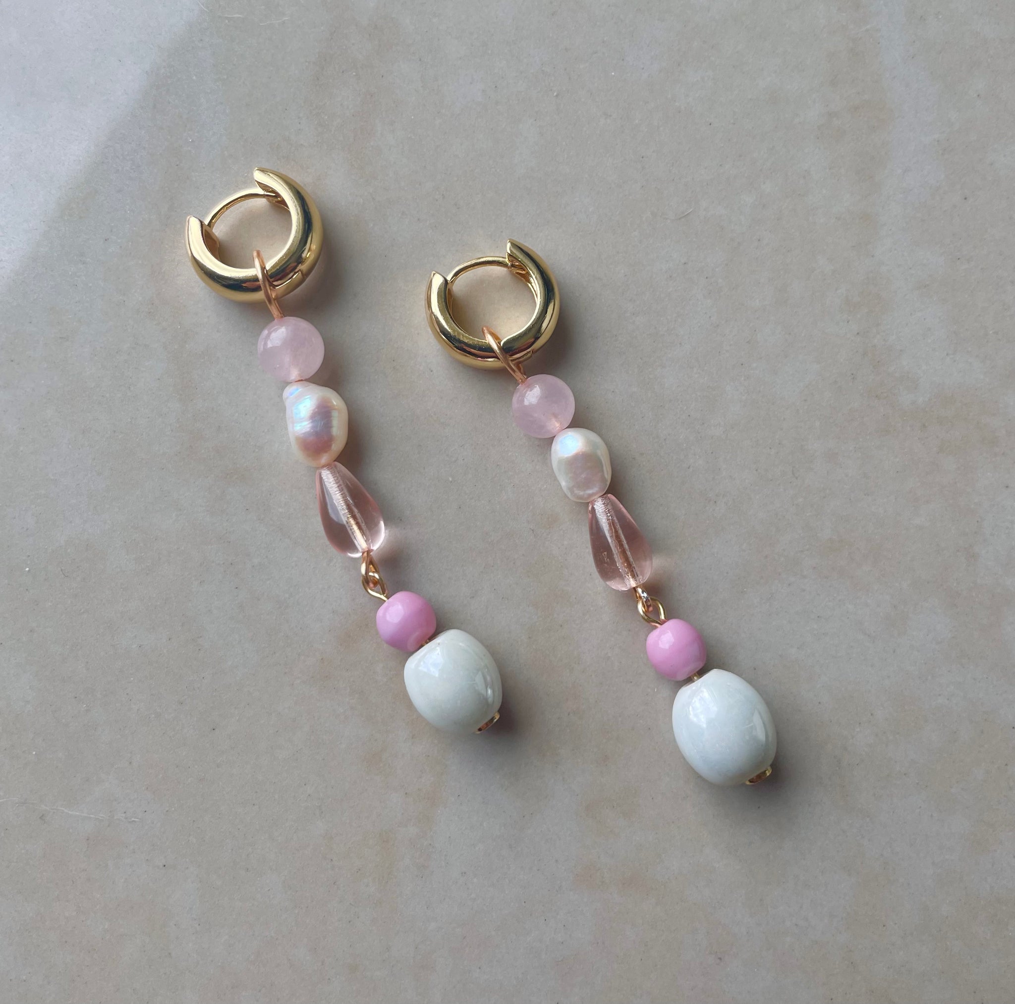 handcrafted with 18k gold filled huggies, vintage glass beads, rose quartz, and fresh water pearls