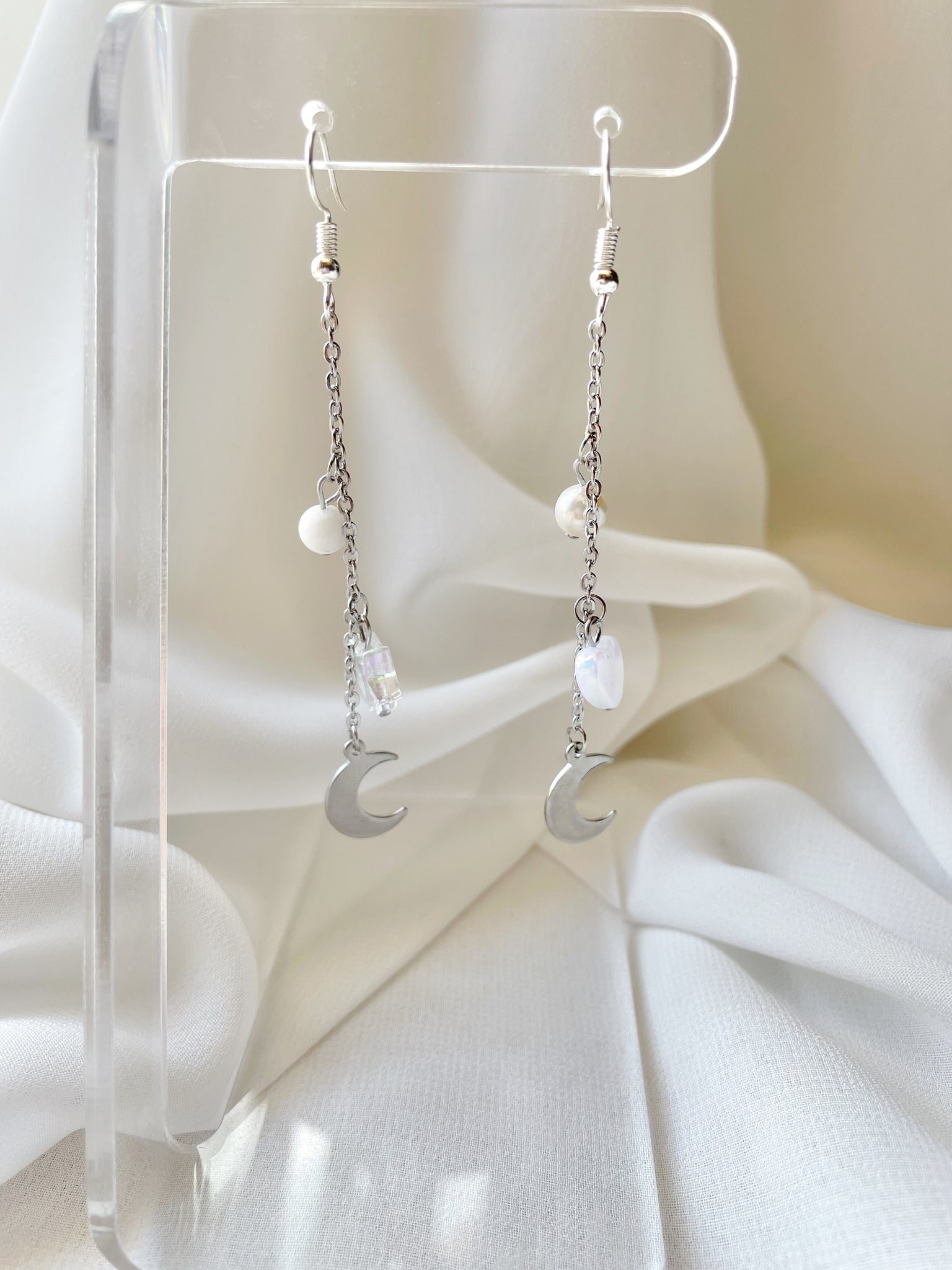 Features genuine moonstone crystals, mother of pearls, stainless steel moon charms, and aura beads