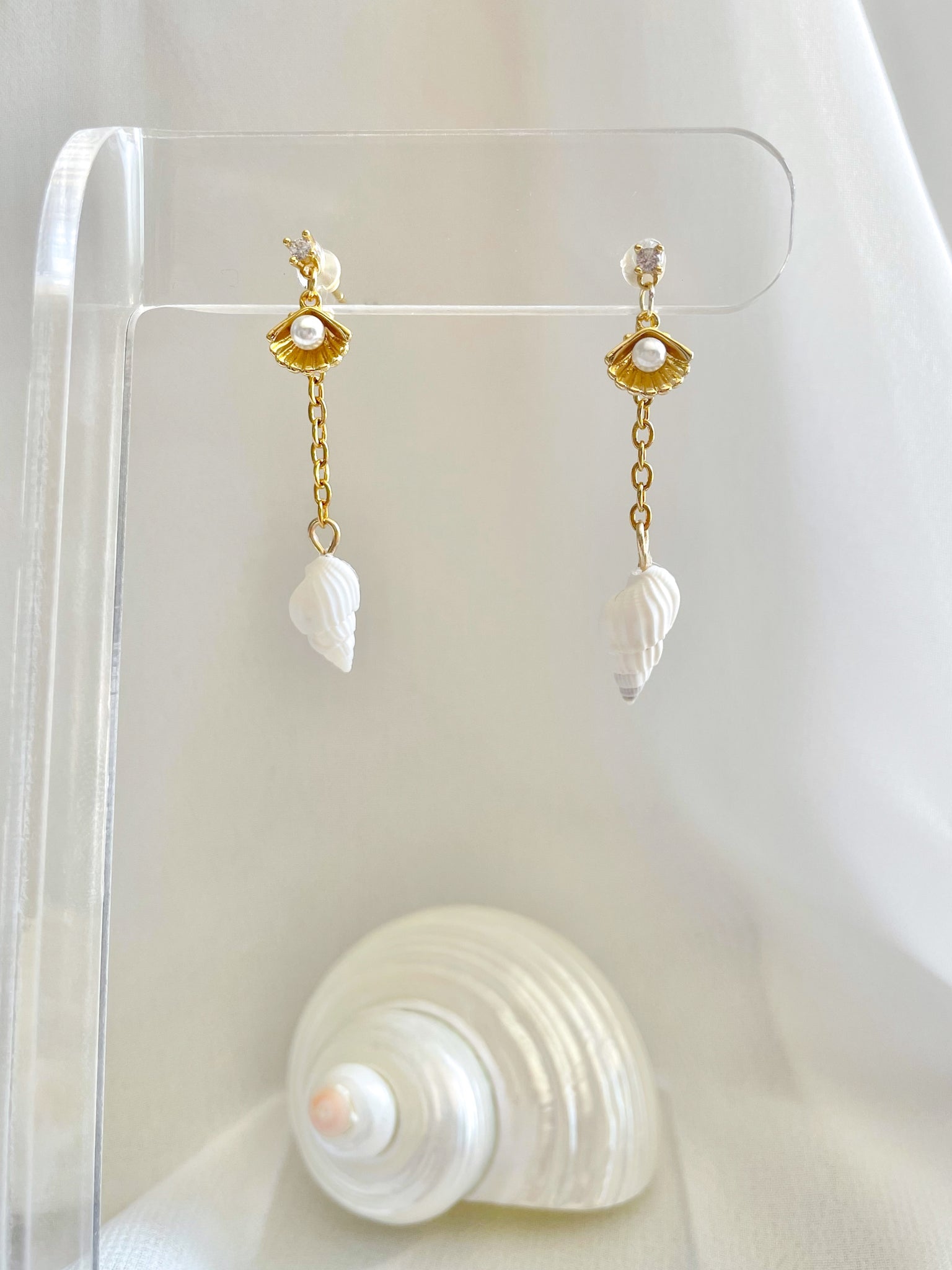 Features genuine conch sea shells handmade with 18k gold filled stud earrings and 18k gold filled pearl & shell charms, & cubic zirconia gems chain details are made with gold stainless steel hypollergenic | nickel free | lead...Read more