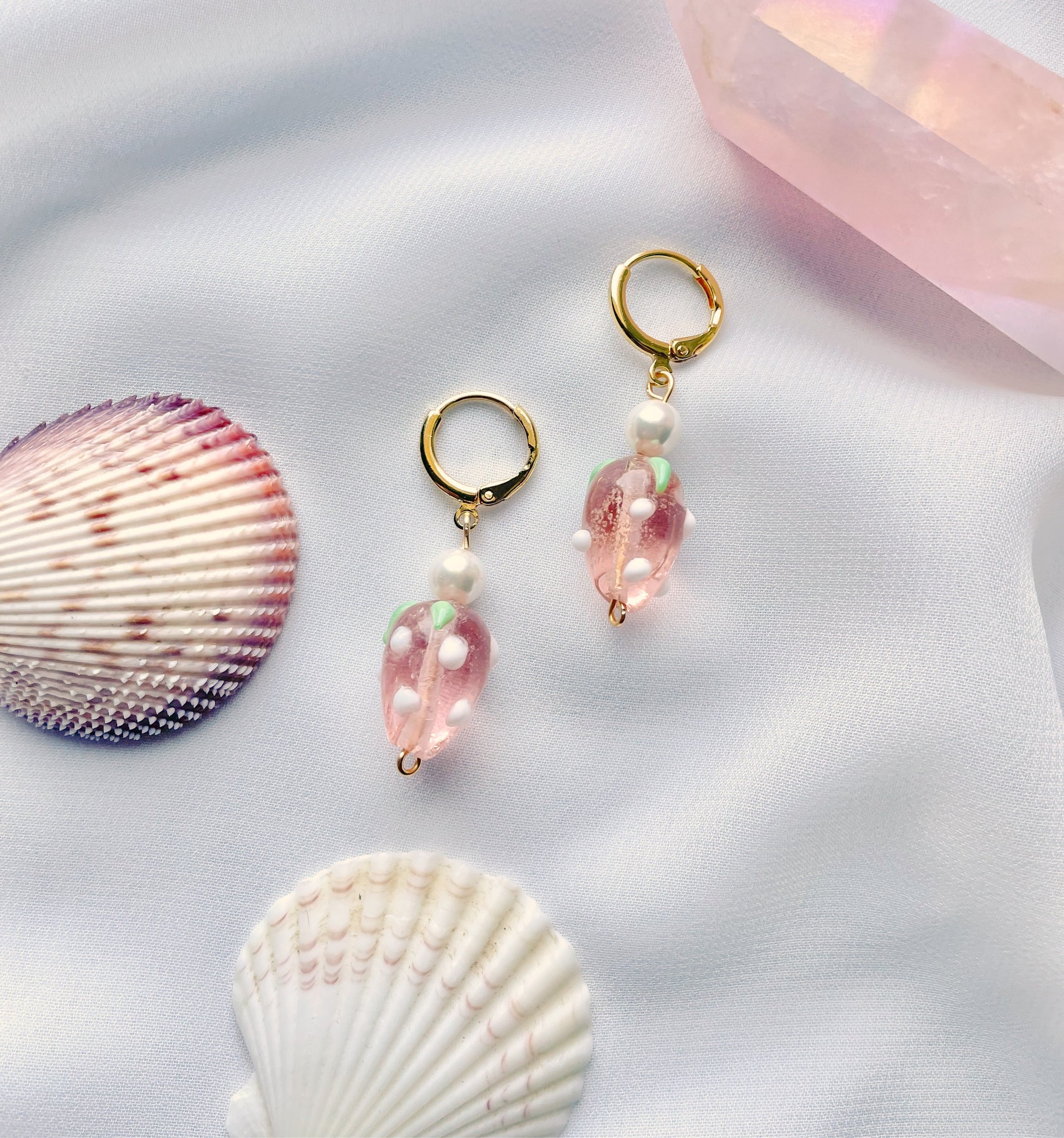Handmade with tarnish resistant jewelry wire, glass strawberry beads, and genuine mother of pearls on hypoallergenic earring clasps