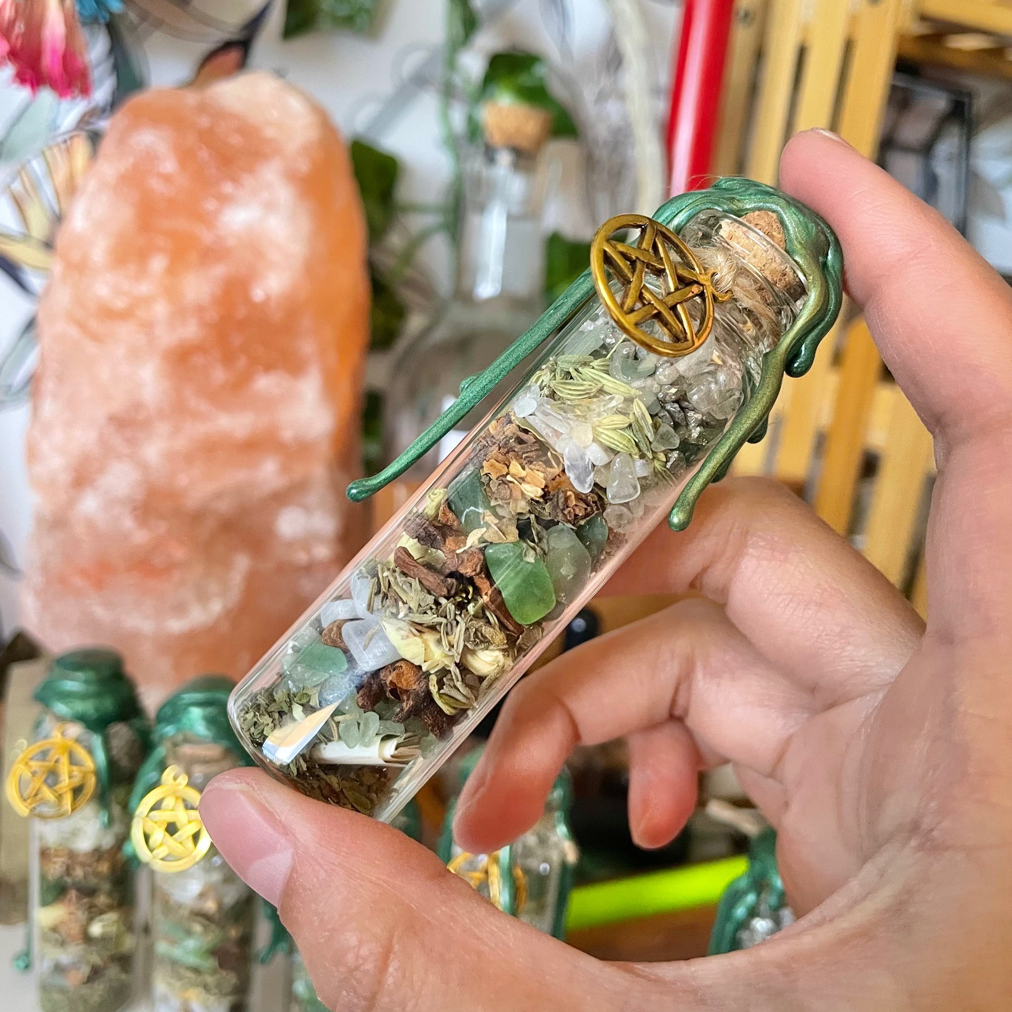Made with my green witchy touch and intentions with 12 different crystals and herbs to help you attract more abundant energy, money, or a career you are trying to get or manifest 💚
