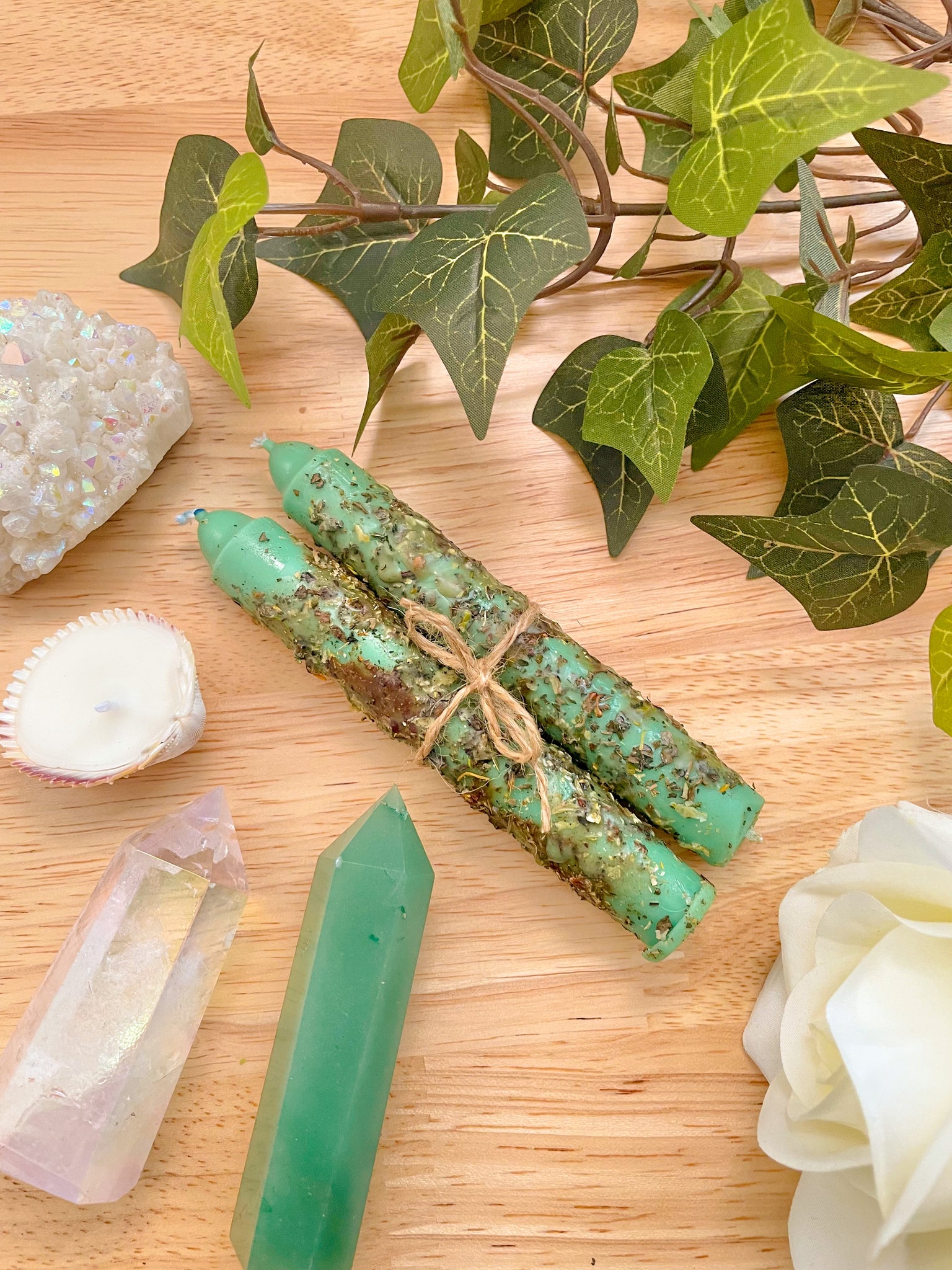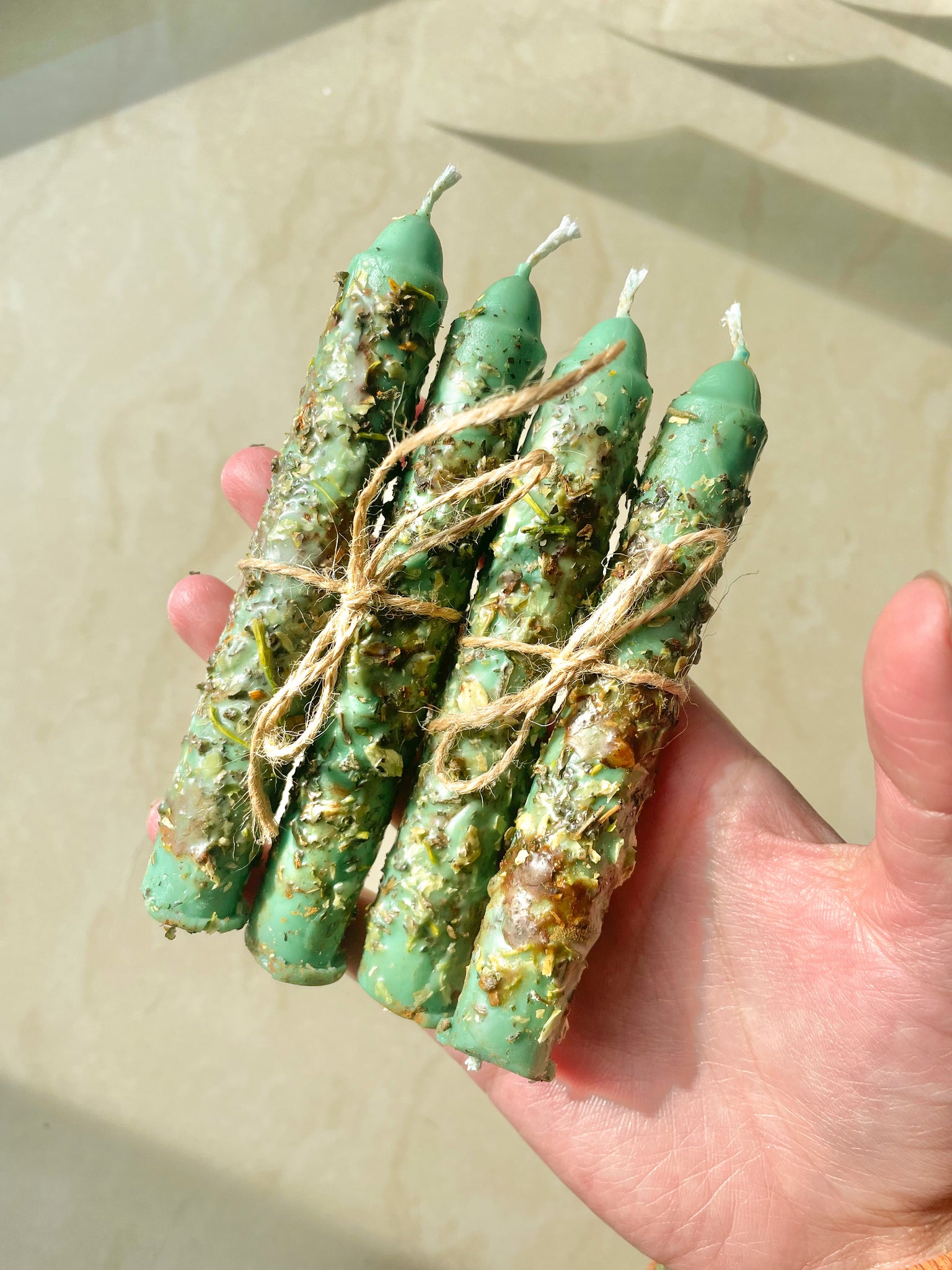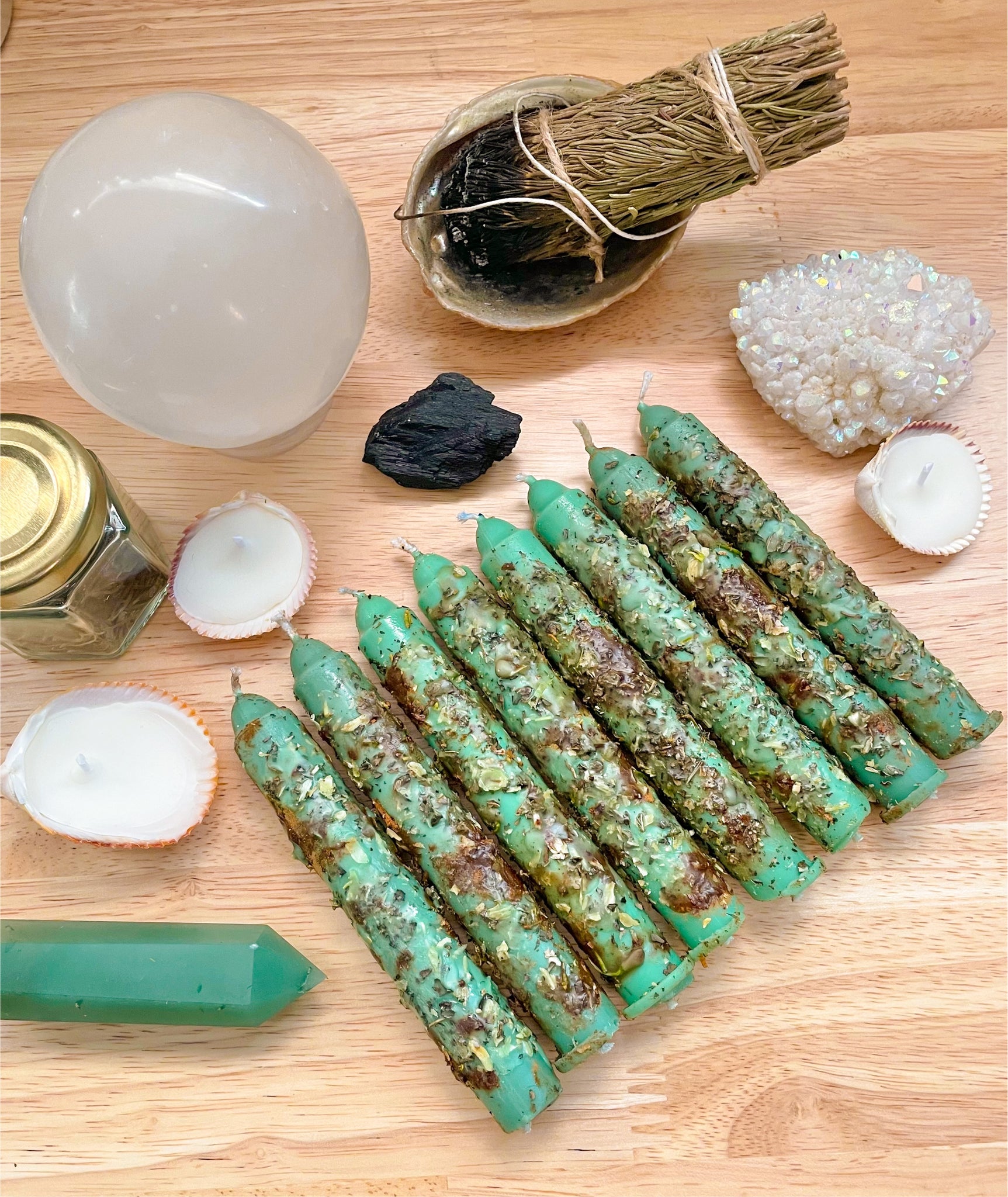 Handmade with all natural beeswax and soy wax blend I created, hand dressed with lots of intention and my witchy energy with quality dried herbs focusing on money, abundance, luck, and success, then hand sealed with beeswax on top to seal the herbs and it’s energy