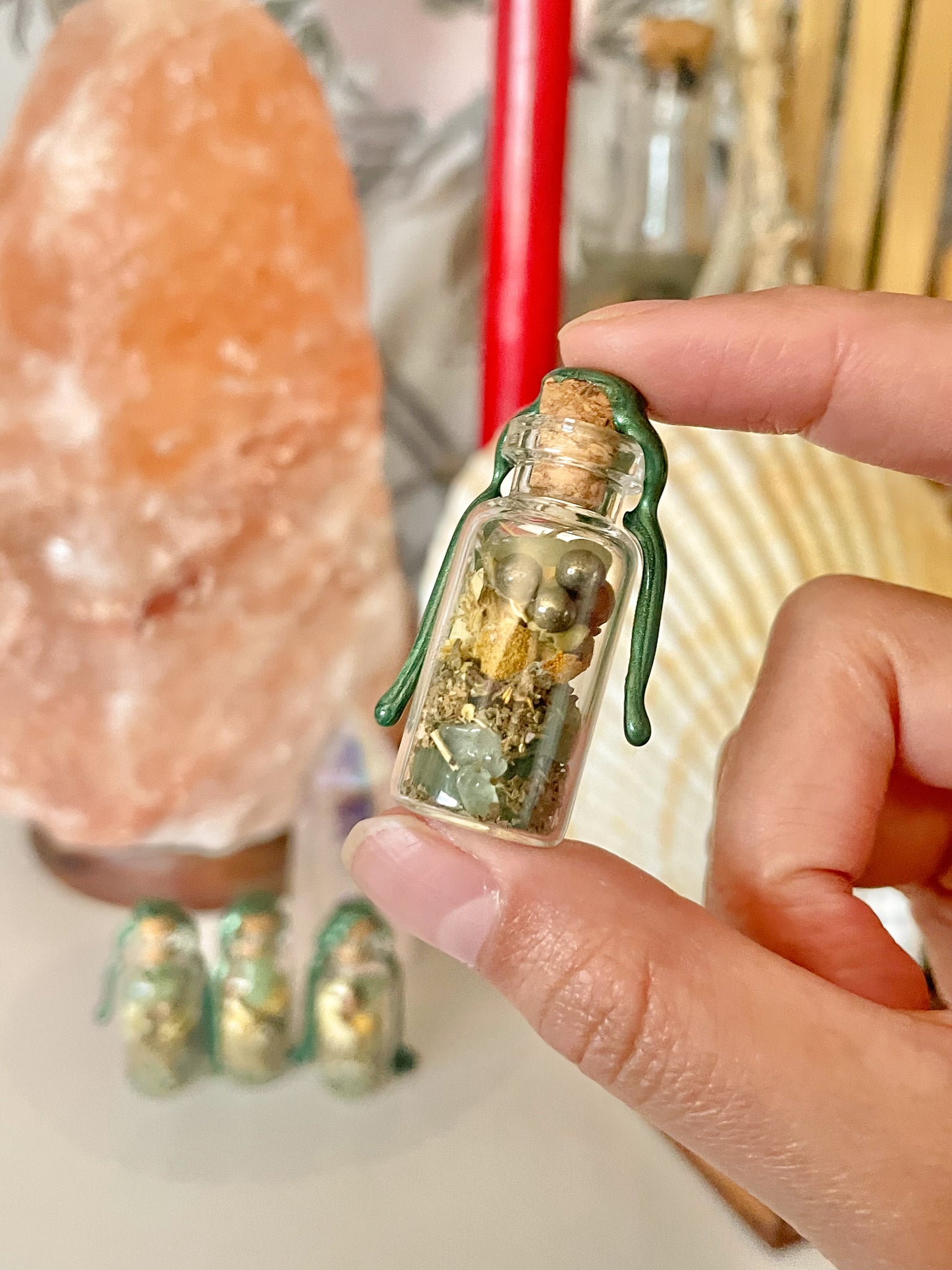 The perfect sized magical spell jars to carry with you to harness abundance, money, luck, & success on the go 💚✨