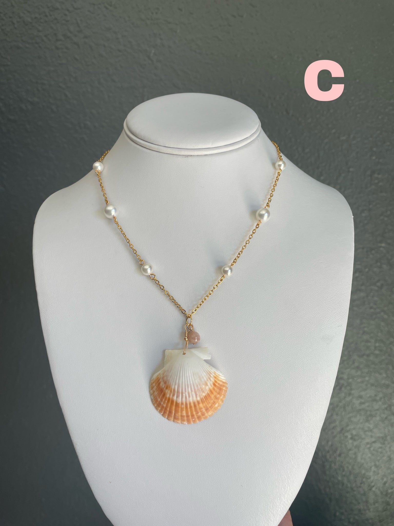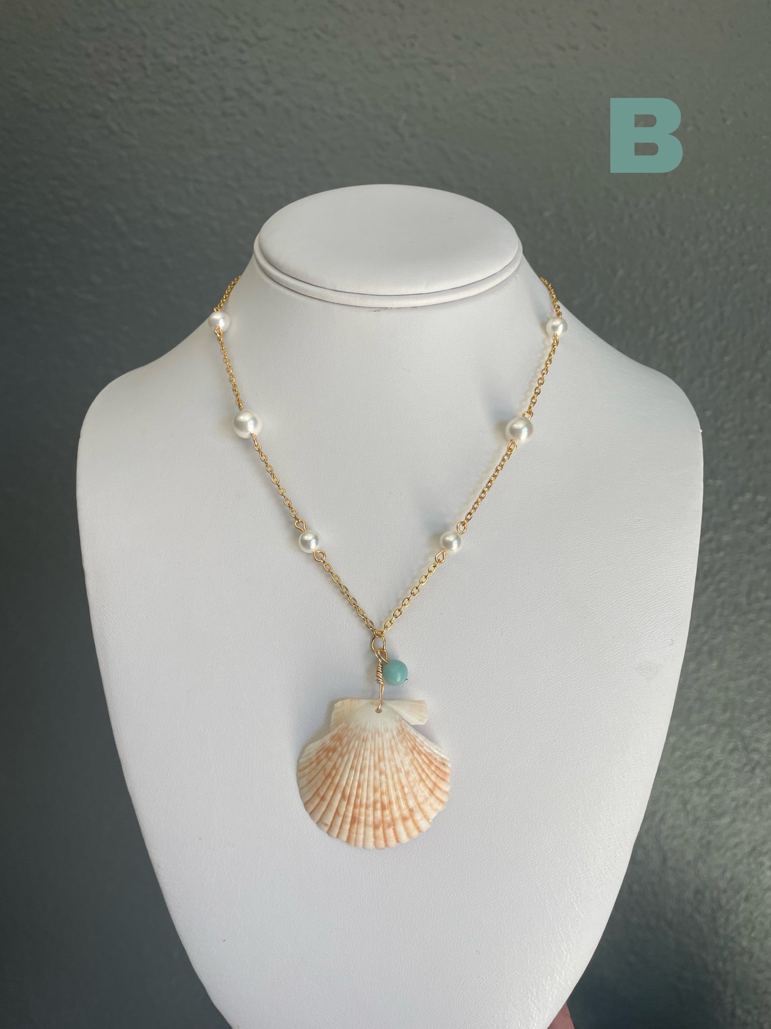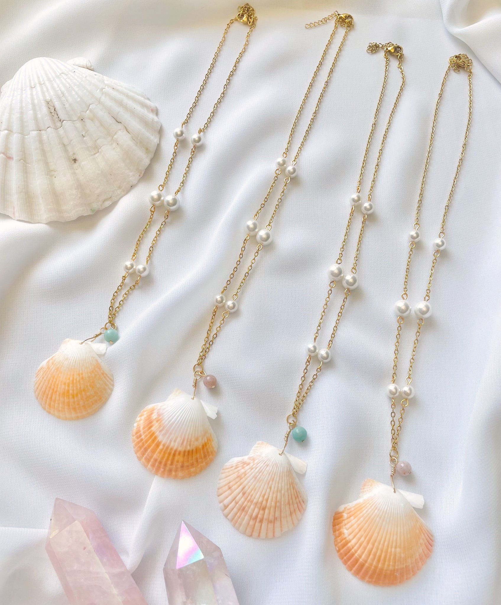 Features genuine hand drilled scallop sea shells, Mother of pearls, Sunstone (pink), Amazonite (blue)