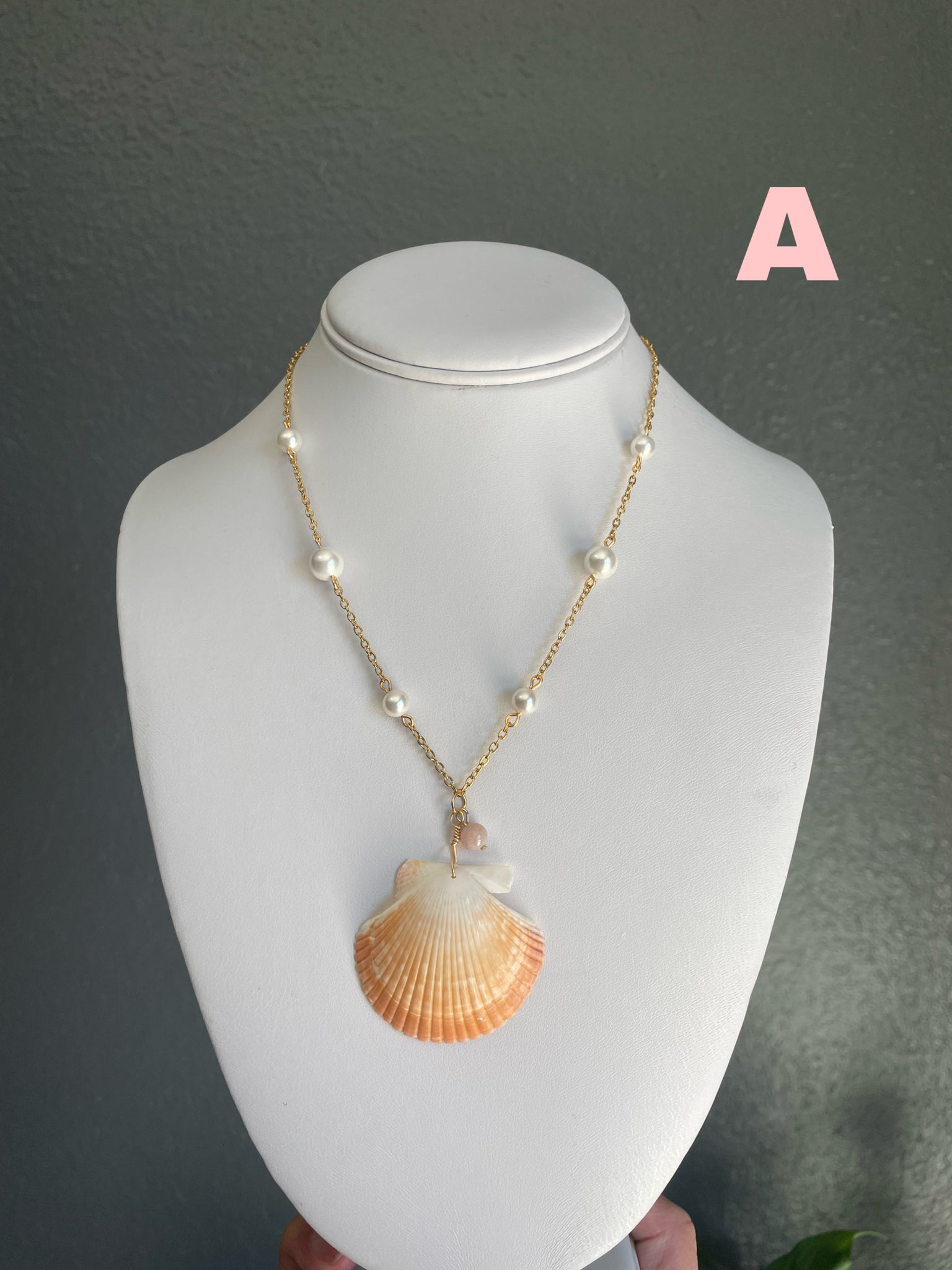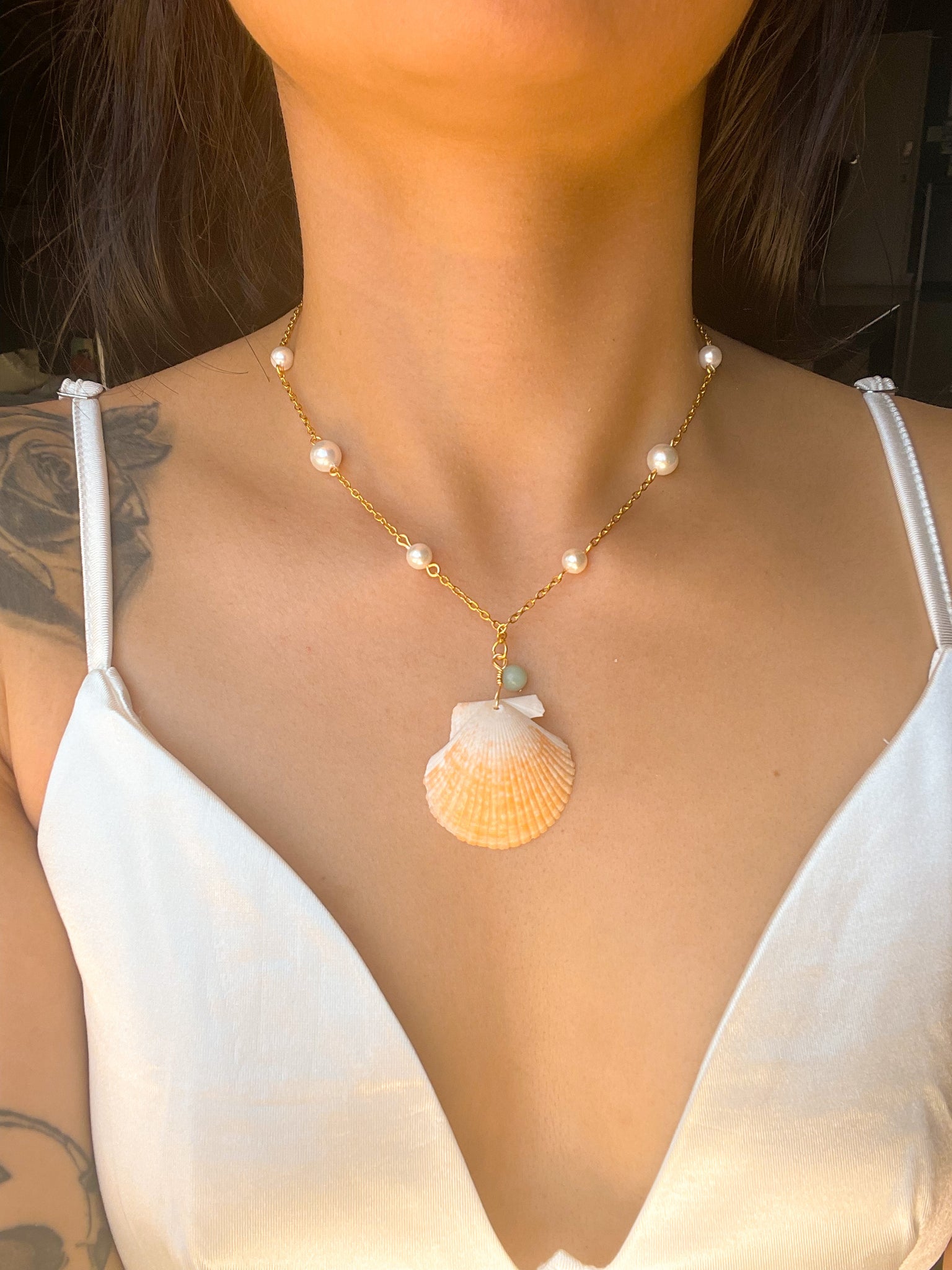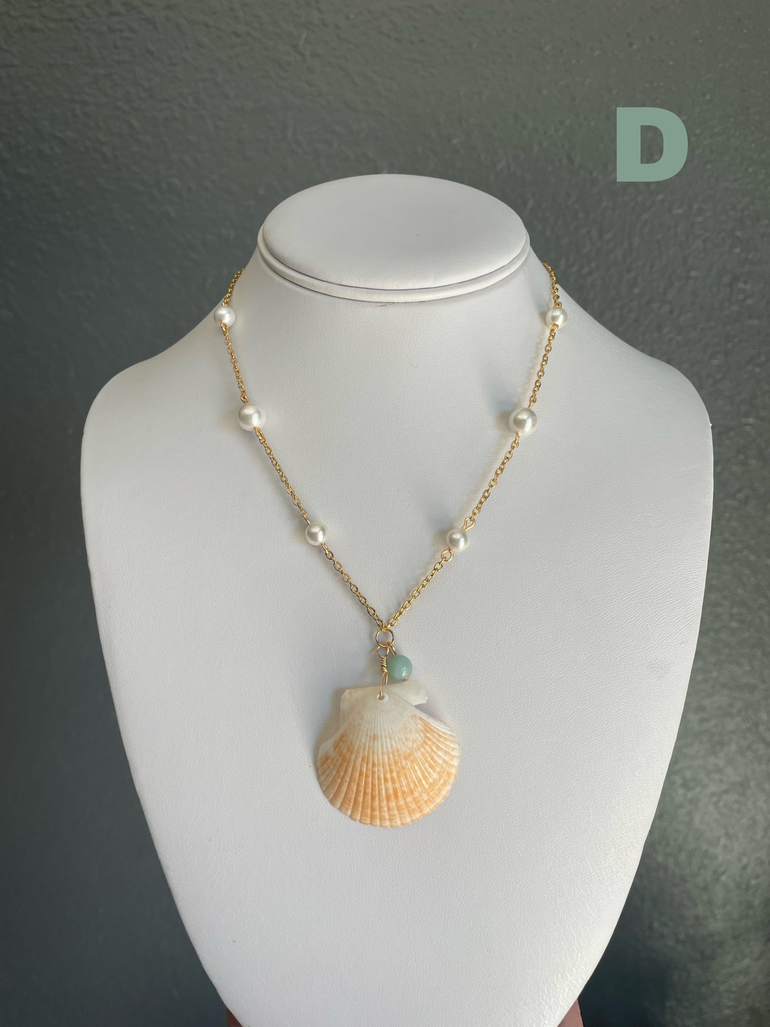 Features genuine hand drilled scallop sea shells, Mother of pearls, Sunstone (pink), Amazonite (blue)