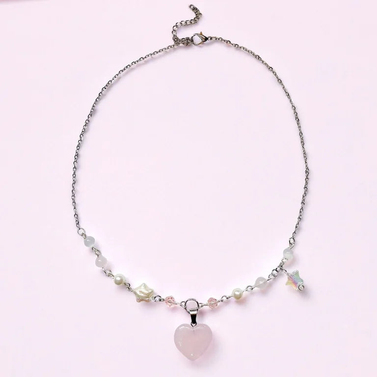 Inspired by Sailor Moon, this stainless steel necklace features a genuine rose quartz heart pendant, a grade aaa star fresh water pearl, mother of pearl, and cats eye.