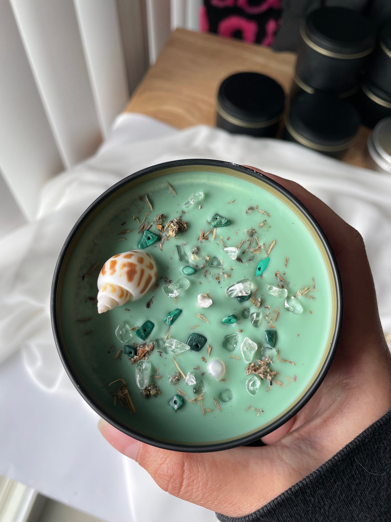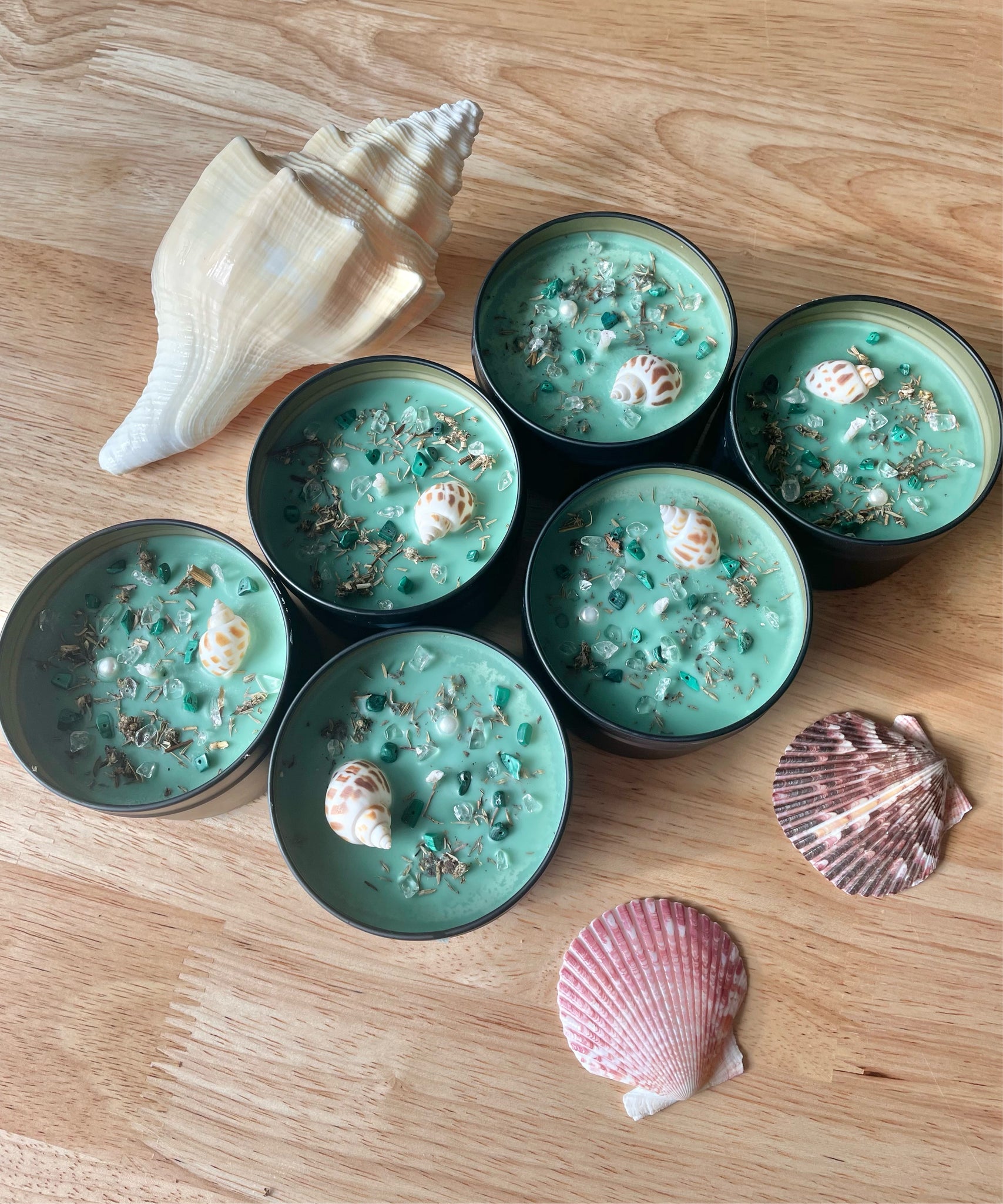Topped with a sea shell, fresh water Pearl, mugwort, thyme, malachite, and clear quartz to match intentions and energy